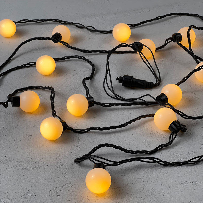 Гирлянда с яркими жёлтыми шариками диаметром 40 мм. Устойчива к влаге и морозу (IP65, −30 °C), работает от сети. Надёжный чёрный каучук, подключение в комплекте. Подходит для улицы, украшения деревьев и фасадов.