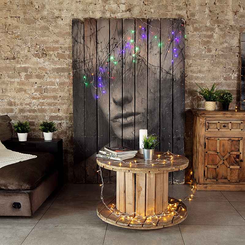 Мультиколор всегда притягивает внимание. Эта гирлянда создаёт настроение — весёлое, нарядное, тёплое. Особенно её любят дети и молодёжь.