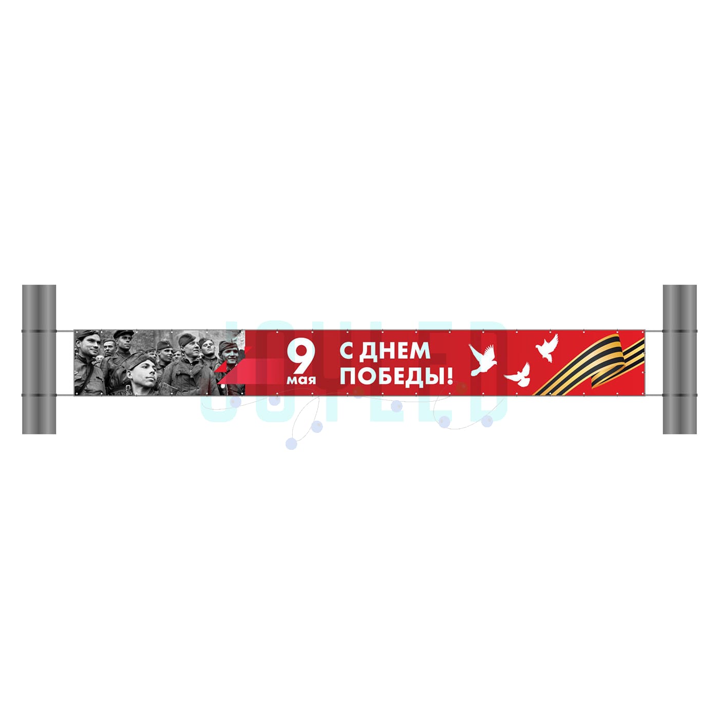 Баннерная световая перетяжка П 021 предназначена для украшения городского пространства на важные события: День Победы, День города, корпоративные и памятные даты. Конструкция выполнена в формате подвеса между двумя опорами, обеспечивая эффектное и читаемое оформление на уровне глаз пешеходов и автомобилистов.