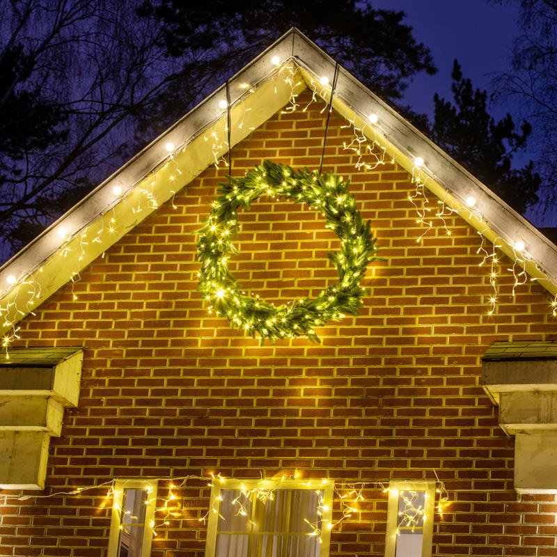 Белт-Лайт JOYLED подходит для фасадов домов, аллей, пергол, навесов, веранд и кафе. Белый провод выглядит аккуратно и сливается с архитектурой светлых зданий — идеален для современных фасадов в стиле минимализм, сканди или неоклассика. Также гирлянда часто используется для подсветки деревьев, балконов и террас, где важно скрыть провод и сохранить чистую визуальную линию.
