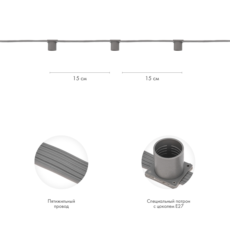 Основу гирлянды составляет надёжный пятижильный ПВХ-провод с круглым сечением, рассчитанный на питание 230 В. 665 патронов E27 обеспечивают совместимость с лампами различного типа — от стандартных светодиодных 3 Вт до декоративных ретро-ламп. Кратность резки «в любом месте между патронами» позволяет гибко адаптировать гирлянду под конкретный объект без потери герметичности.