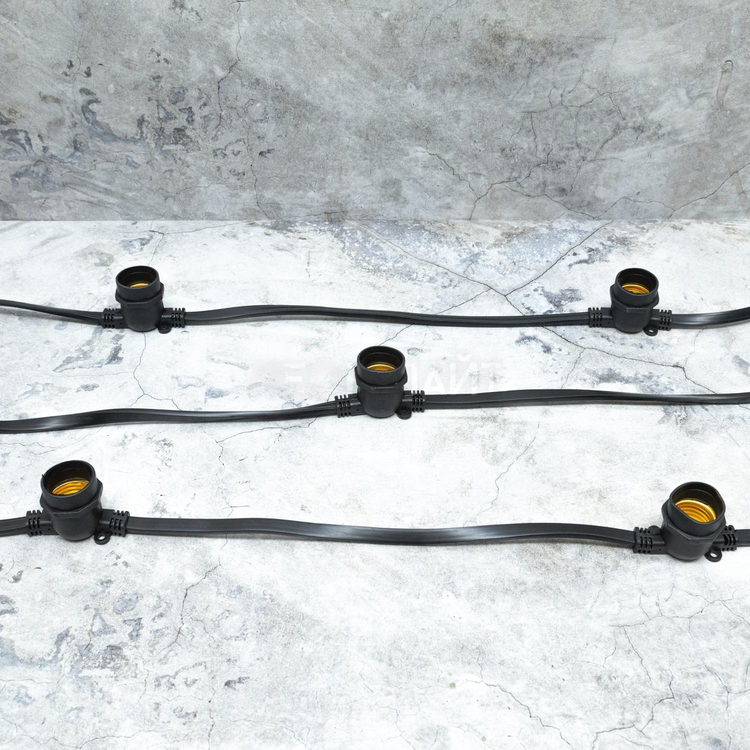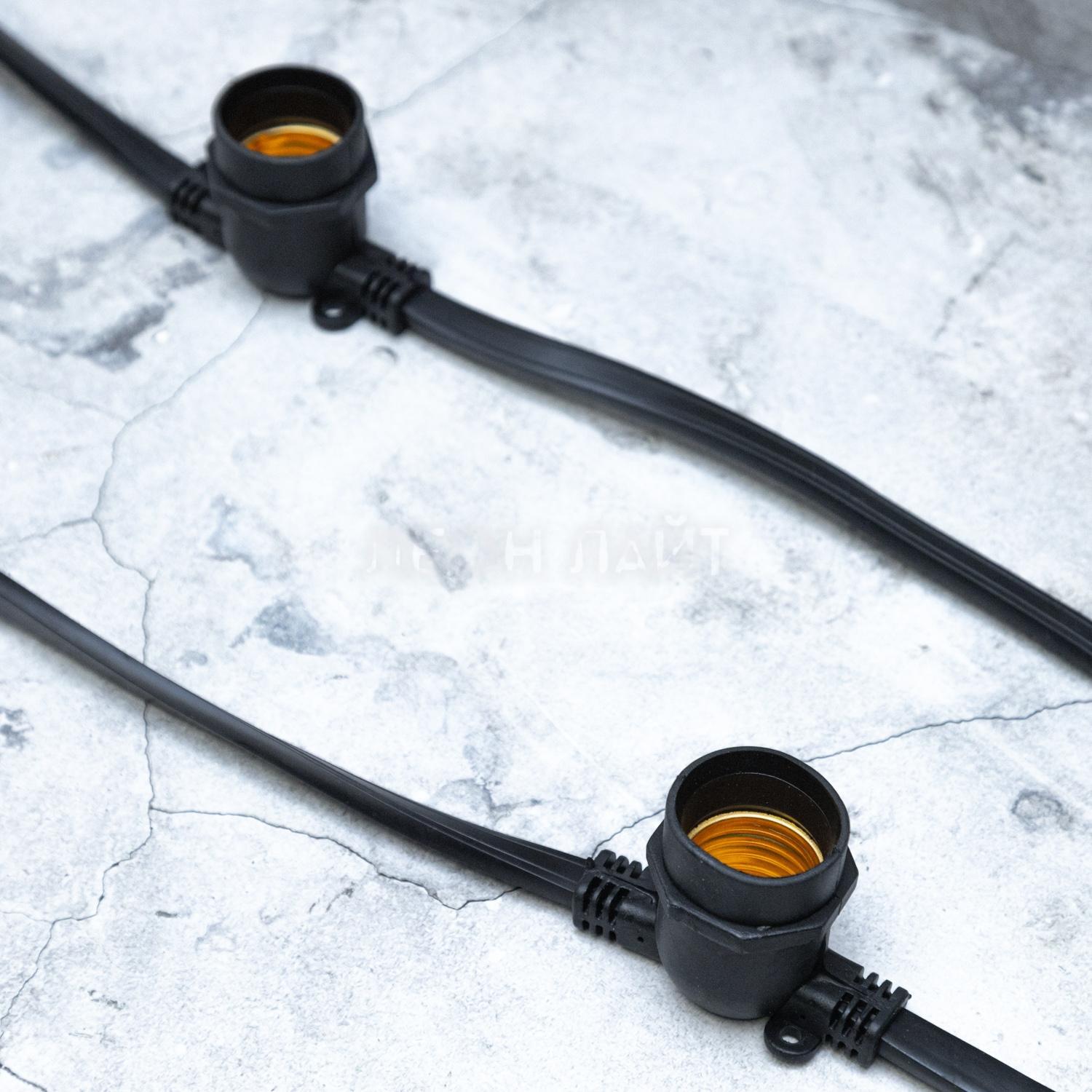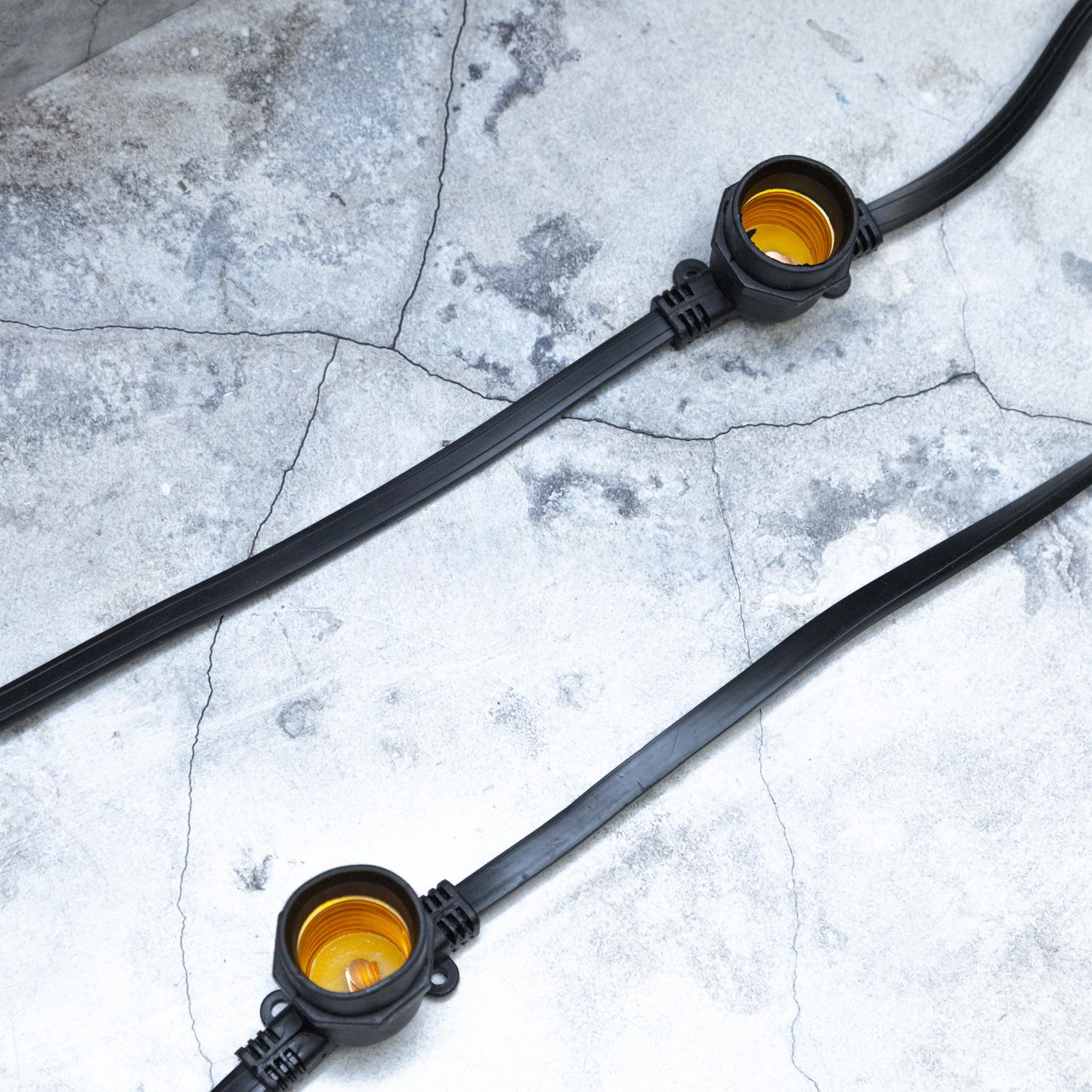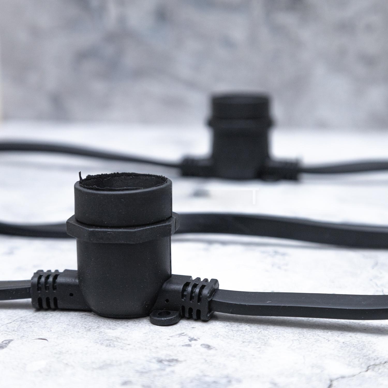 Плоский формат провода упрощает монтаж и делает фиксацию на поверхности максимально аккуратной. Шаг между лампами 40 см обеспечивает оптимальное распределение света — идеально для кафе, фасадов и деревьев.