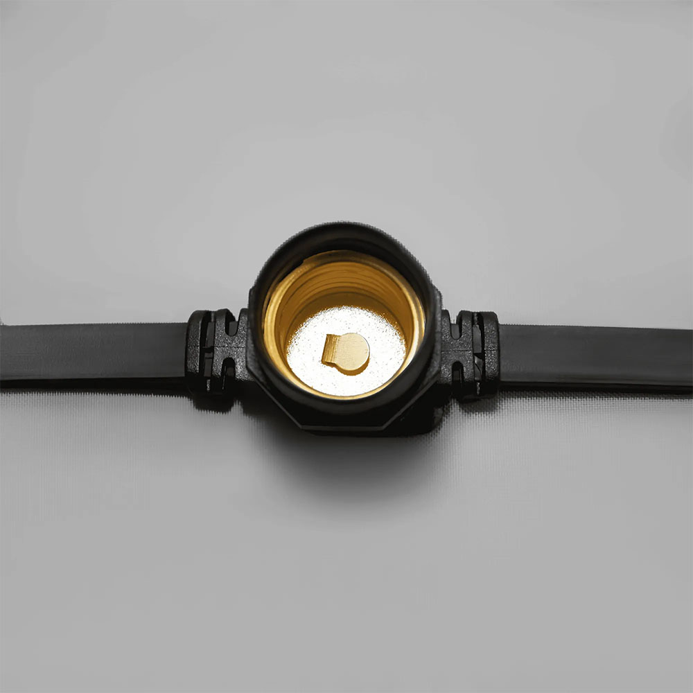 Плоский чёрный ПВХ-провод из меди сохраняет гибкость при низких температурах и обеспечивает стабильную передачу тока. Гирлянду можно разрезать в любом месте между патронами, подгоняя длину под нужный объект. Допускается соединение до 10 отрезков в одну цепь — это удобно при оформлении длинных фасадов или аллей.