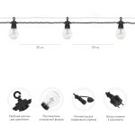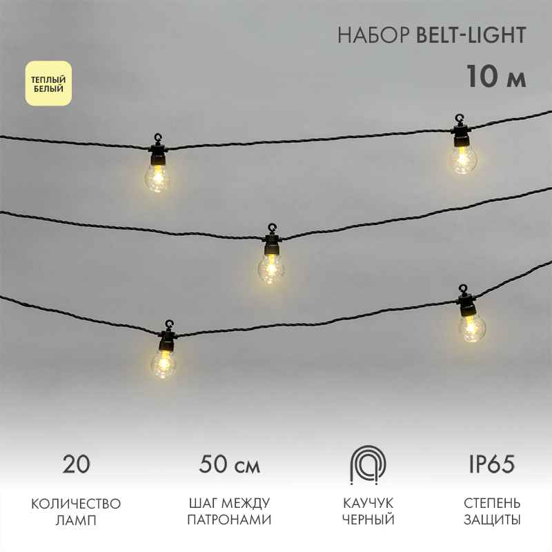 Гирлянда Белт-Лайт «Лофт» 10 м, провод чёрный каучук, шаг 50 см, 20 прозрачных тепло-белых патронов, IP44