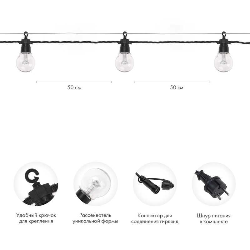 Провод изготовлен из износостойкого каучука, устойчивого к влаге, солнцу и механическим нагрузкам. Он не трескается на морозе и не выцветает под действием ультрафиолета. Каждый патрон E27 надёжно герметизирован, что исключает короткие замыкания даже при осадках. Чёрный цвет кабеля подчёркивает лофт-стиль и делает гирлянду универсальной для любых поверхностей — дерева, камня, металла или штукатурки.