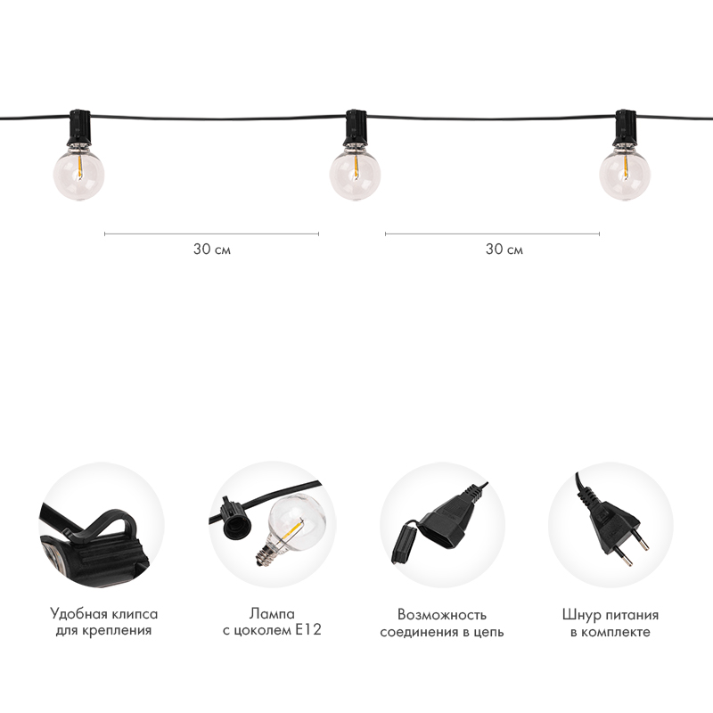 Патроны E12 подходят для мини-ламп и LED-светильников, обеспечивая низкое энергопотребление — всего 5 Вт на всю линию. Гирлянда работает тихо, без нагрева и мерцания. Срок службы ламп — до 50 000 часов. Белт-Лайт JOYLED — это экономичное, безопасное и долговечное освещение для дома и коммерческих площадок.