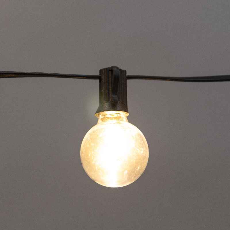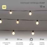 Белт-Лайт «Лофт» — уличная гирлянда длиной 15 м с 50 прозрачными тепло-белыми патронами E12 и чёрным каучуковым проводом IP44.