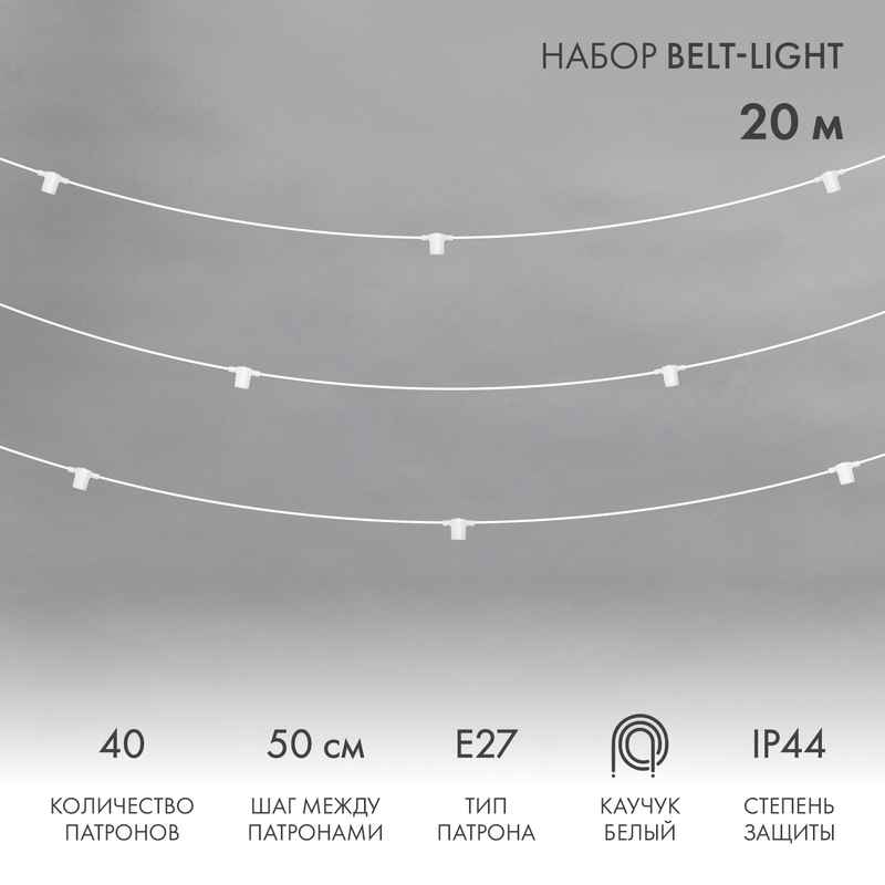 Белт-лайт «Лофт» — профессиональная уличная гирлянда длиной 20 м с 40 патронами E27 и белым каучуковым проводом IP44. Устойчива к дождю, ветру и морозу до −25 °C. Подходит для подсветки фасадов, беседок, заборов и террас. Совместима с лампами накаливания и LED. Решение для тех, кто ценит уют и надёжность в уличном освещении.