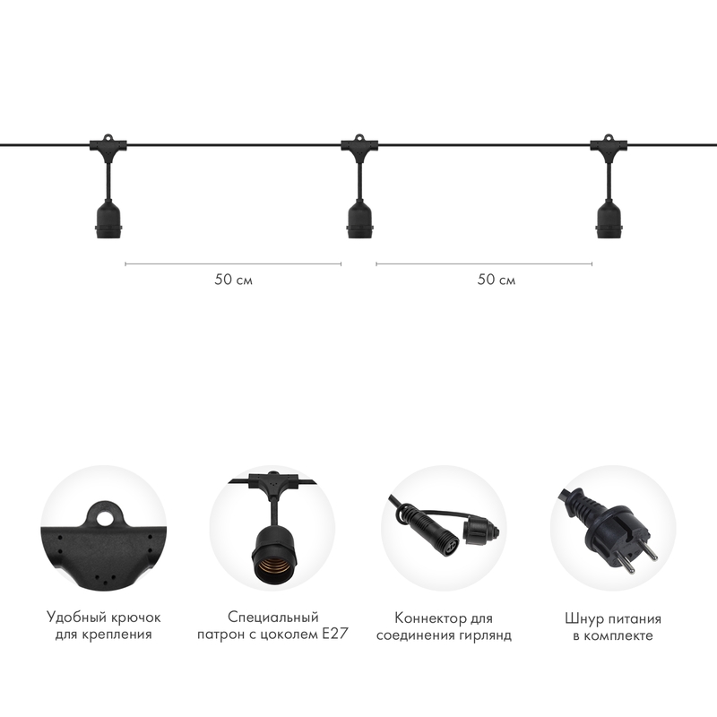 Кабель изготовлен из каучука, который не боится осадков и ультрафиолета. Он сохраняет гибкость даже в мороз, не трещит и не ломается со временем. Чёрный провод выглядит лаконично и органично на тёмных фасадах или металлических конструкциях. Подвесные патроны E27 расположены через каждые 50 см и надёжно защищены от влаги и пыли. Белт-Лайт JOYLED подходит для ежедневной работы на улице и в помещениях — в любое время года.