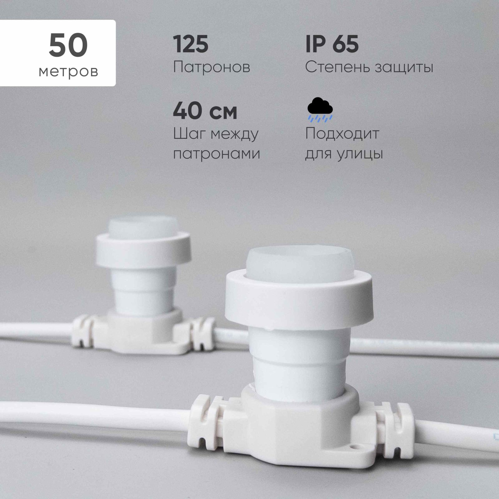 Белт-Лайт LTC 50 м, шаг 40 см от JOYLED — это надёжная профессиональная гирлянда для украшения фасадов, террас и летних кафе. На длине 50 метров расположено 125 патронов E27 через каждые 40 см — свет распределяется равномерно, создавая мягкое сияние без «провалов». Белый каучуковый провод идеально сочетается со светлыми стенами и декором, а вечером отражает свет, усиливая эффект подсветки. Материал кабеля устойчив к перепадам температур (от −30 до +50 °C), ультрафиолету и влаге. Степень защиты IP65 гарантирует безопасную работу в любое время года. Гирлянда не боится дождя, снега и пыли, а герметичные патроны надежно защищают контакты от влаги.