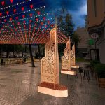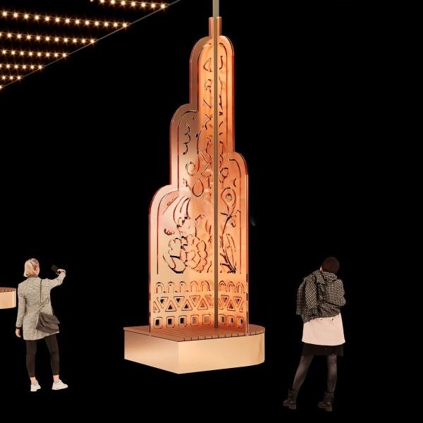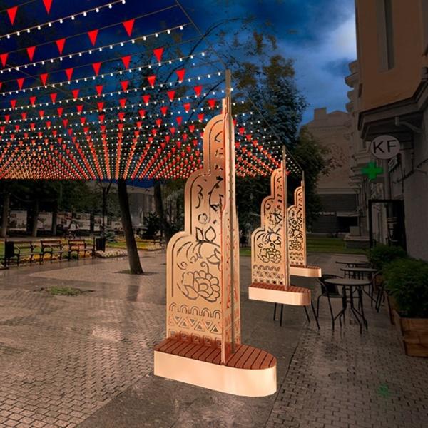 Фигура спроектирована как несущий элемент для светового потолка — это когда между столбами натягиваются гирлянды или создаётся подвесная композиция. А встроенная скамейка делает объект не просто техническим элементом, а частью городской среды.
