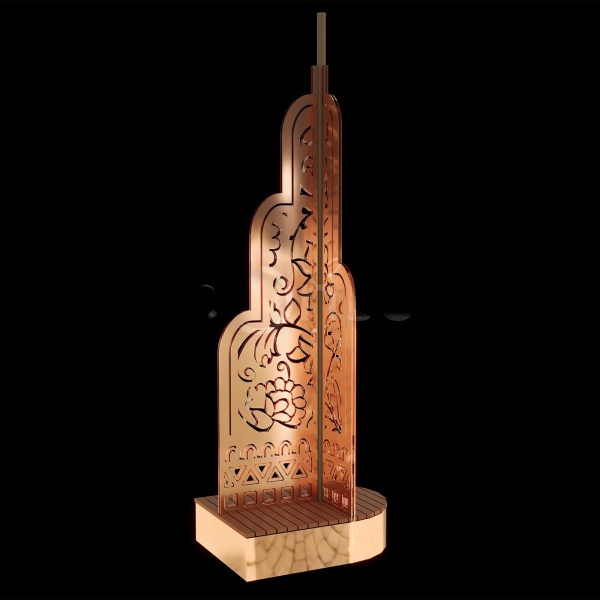 Архитектурный элемент для организации светового потолка и отдыха в общественном пространстве. Столб с интегрированной скамейкой, золотой каркас, высота 6 метров. Устойчив к уличным условиям, подходит для оформления аллей, входных групп, катков и зон фестивалей.