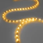 360-градусное свечение и высокая плотность диодов (36 LED/м) гарантируют равномерное распределение света по всей длине ленты без провалов и тёмных участков. Благодаря прозрачной оболочке луч мягко рассеивается, создавая чистый и внятный световой контур. Жёлтый оттенок отлично сочетается с белыми и зелёными гирляндами, делая оформление тёплым и торжественным.