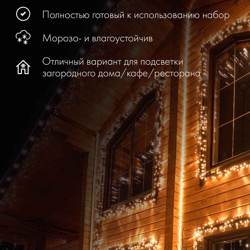 Дюралайт серии OUTDOOR разработан для эксплуатации в любых погодных условиях. Уровень защиты IP65 гарантирует полную пыленепроницаемость и устойчивость к влаге. Лента безопасно работает под дождём и снегом, не боится мороза и летней жары — диапазон температур от –25 до +40 °C.