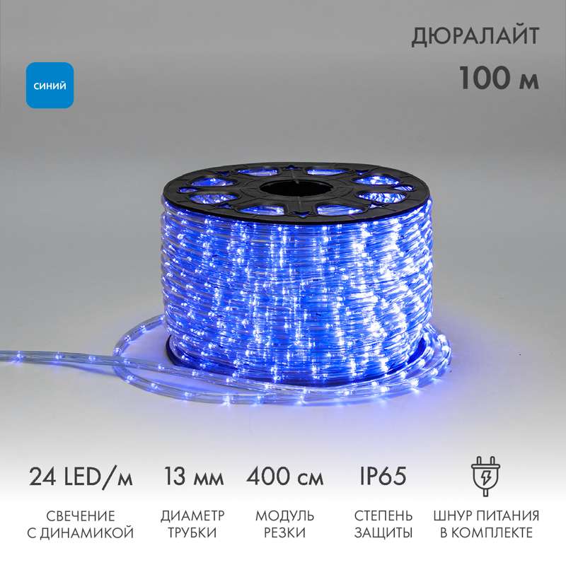 Купить Светодиодный Дюралайт Ø13 мм, трёхжильный, СИНИЙ, 230 В, 24 LED/м, с динамическим свечением, модуль 4 м, бухта 100 м в интернет-магазине компании JOYLED в Москве.