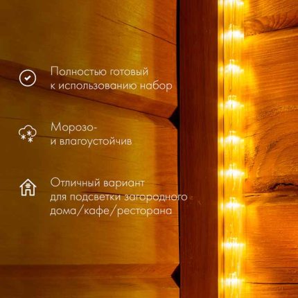 Дюралайт серии OUTDOOR разработан для уличного применения. Он не боится дождя, снега и ветра — защита IP65 обеспечивает пыленепроницаемость и влагозащиту при эксплуатации в любую погоду. Диапазон рабочих температур от –25 до +40 °C позволяет использовать гирлянду круглый год: зимой для новогоднего декора, летом — для подсветки веранд и террас.