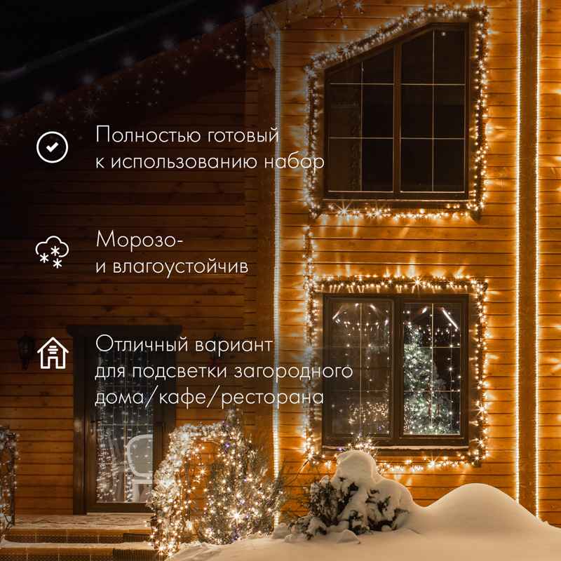 JOYLED использует диоды с плотностью 24 LED/м, что гарантирует насыщенное свечение без “провалов”. Модель рассчитана на напряжение 230 В, не требует контроллера и подходит для постоянной подсветки фасадов частных домов, кафе и городских объектов.