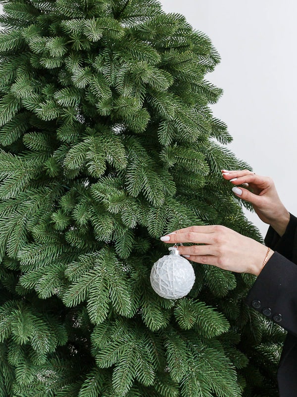 Ветки крепятся на шарнирах — они автоматически опускаются при сборке, образуя ровную симметричную крону без просветов. Сборка занимает не более 15 минут и не требует инструментов. После сезона ёлка легко разбирается и компактно хранится до следующего года.