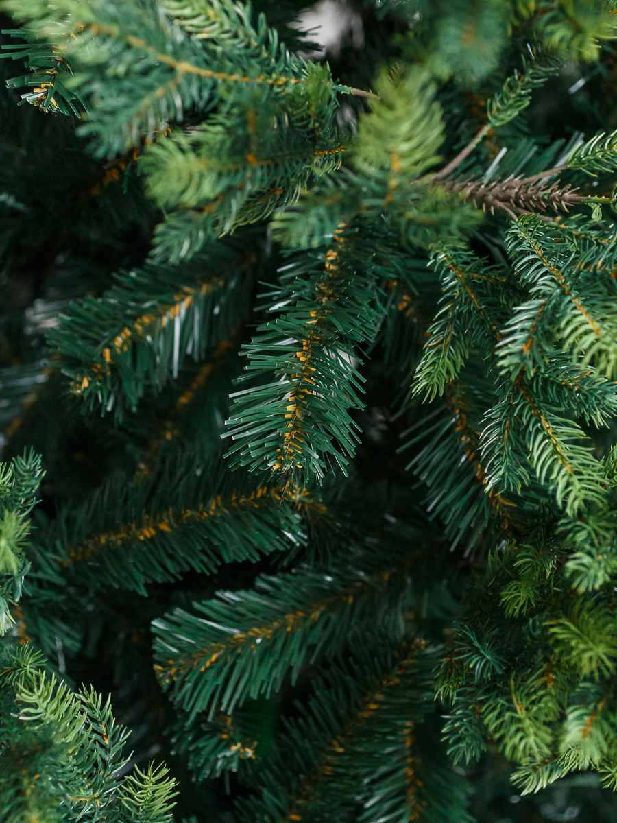Иглы выполнены из плотной плёнки ПВХ, имитирующей фактуру настоящей ели. Они не осыпаются, не ломаются и не выцветают. Материал безопасен, не имеет запаха и не поддерживает горение.