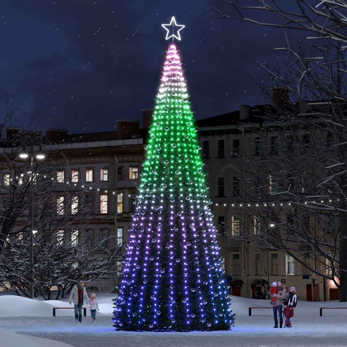 Благодаря управляемым сценариям ёлка способна менять цветовую гамму, имитировать движение огней или переливы фейерверков. Такой формат оформления идеально подходит для общественных пространств, торговых комплексов, деловых центров и городских площадей.