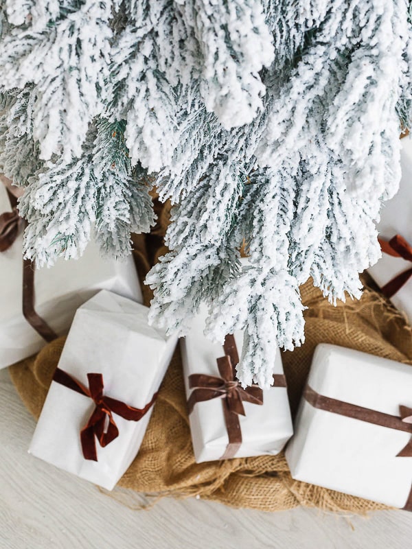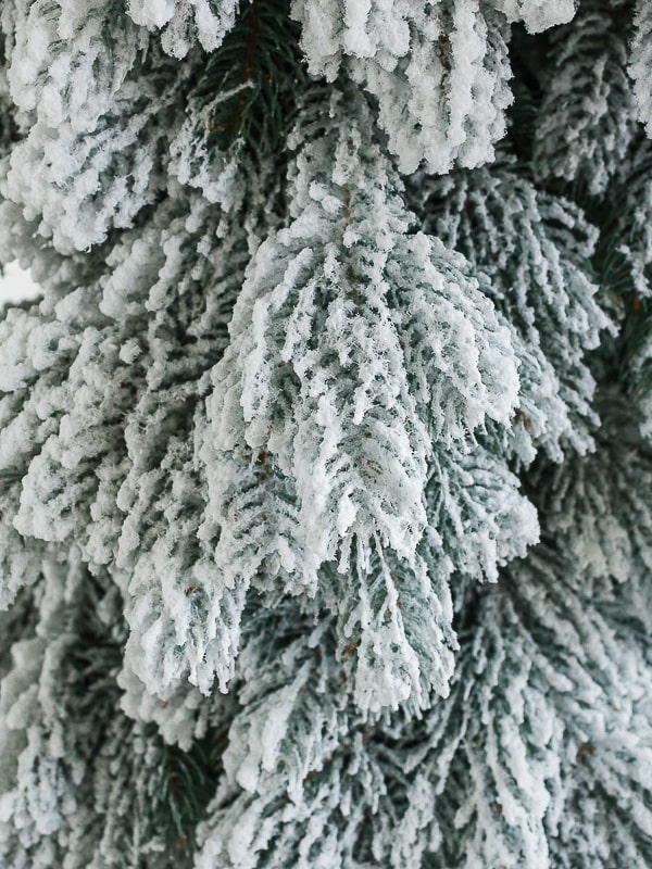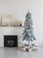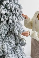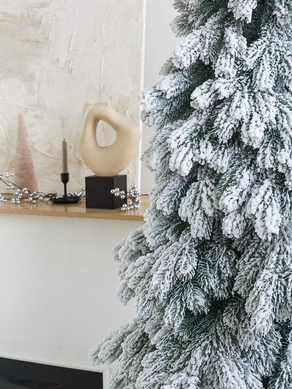 Основной акцент в дизайне сделан на имитацию свежевыпавшего снега. Ветки покрыты белым напылением, напоминающим лёгкий иней или снегопад. Даже без украшений такая ёлка смотрится по-зимнему уютно.