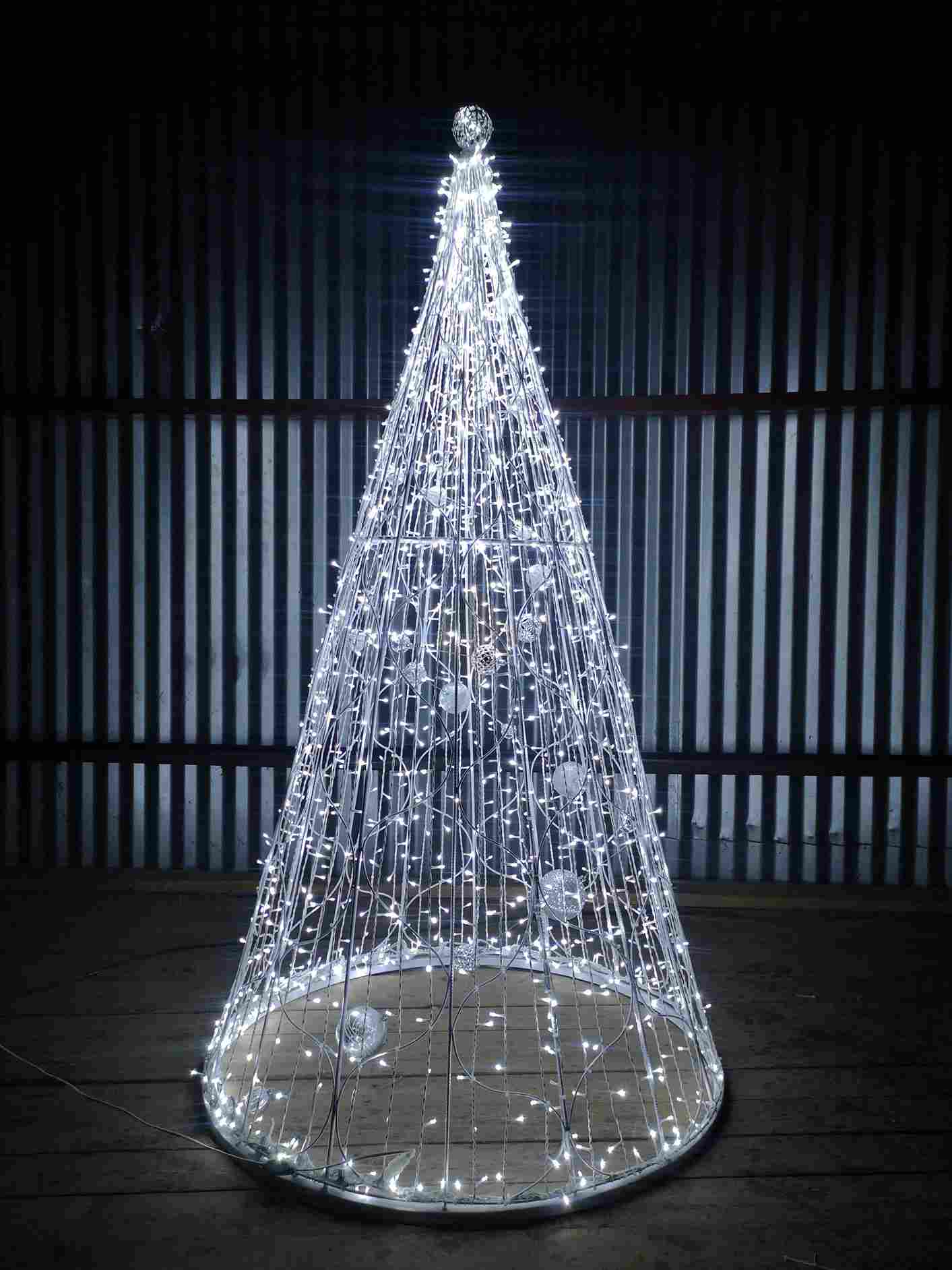 Форма конуса обеспечивает равномерное распределение света и чёткий силуэт. Это решение визуально вытягивает пространство и придаёт всей композиции стройность и симметрию. Елка прекрасно смотрится как отдельно, так и в составе группы: например, на центральной площади, вдоль дорожек, на фоне фасада здания или при входе в торговый центр.