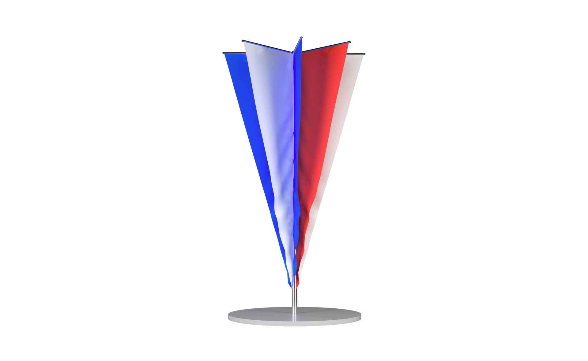 Изделие представляет собой вертикальную композицию из пяти стилизованных флагов, объединённых в единую металлоконструкцию. Высота 4 метра позволяет использовать конструкцию как самостоятельный акцент или в составе праздничной композиции.