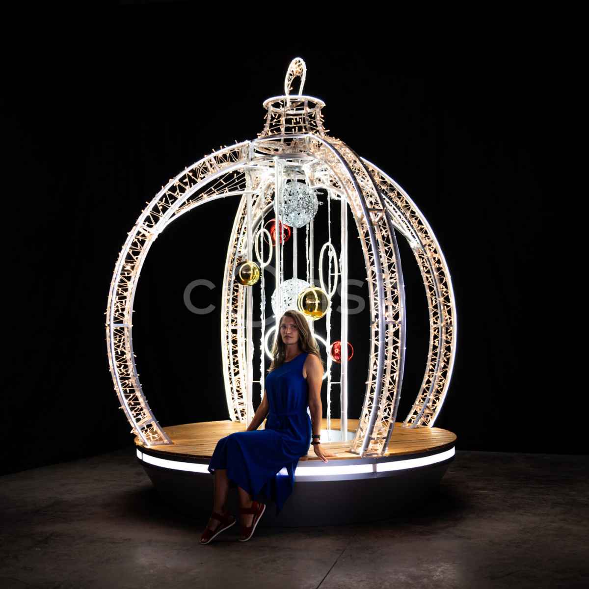 Фотозона быстро становится центром внимания. Особенно она актуальна в вечернее время — когда свет мягко заливает пространство, а подвески внутри шара создают праздничную динамику и глубину.