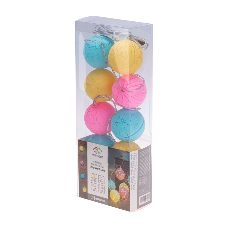 Гирлянда «Карамельки» создаёт тёплое настроение и подчёркивает праздничный стиль любого пространства — от квартиры до кафе и фотостудии.