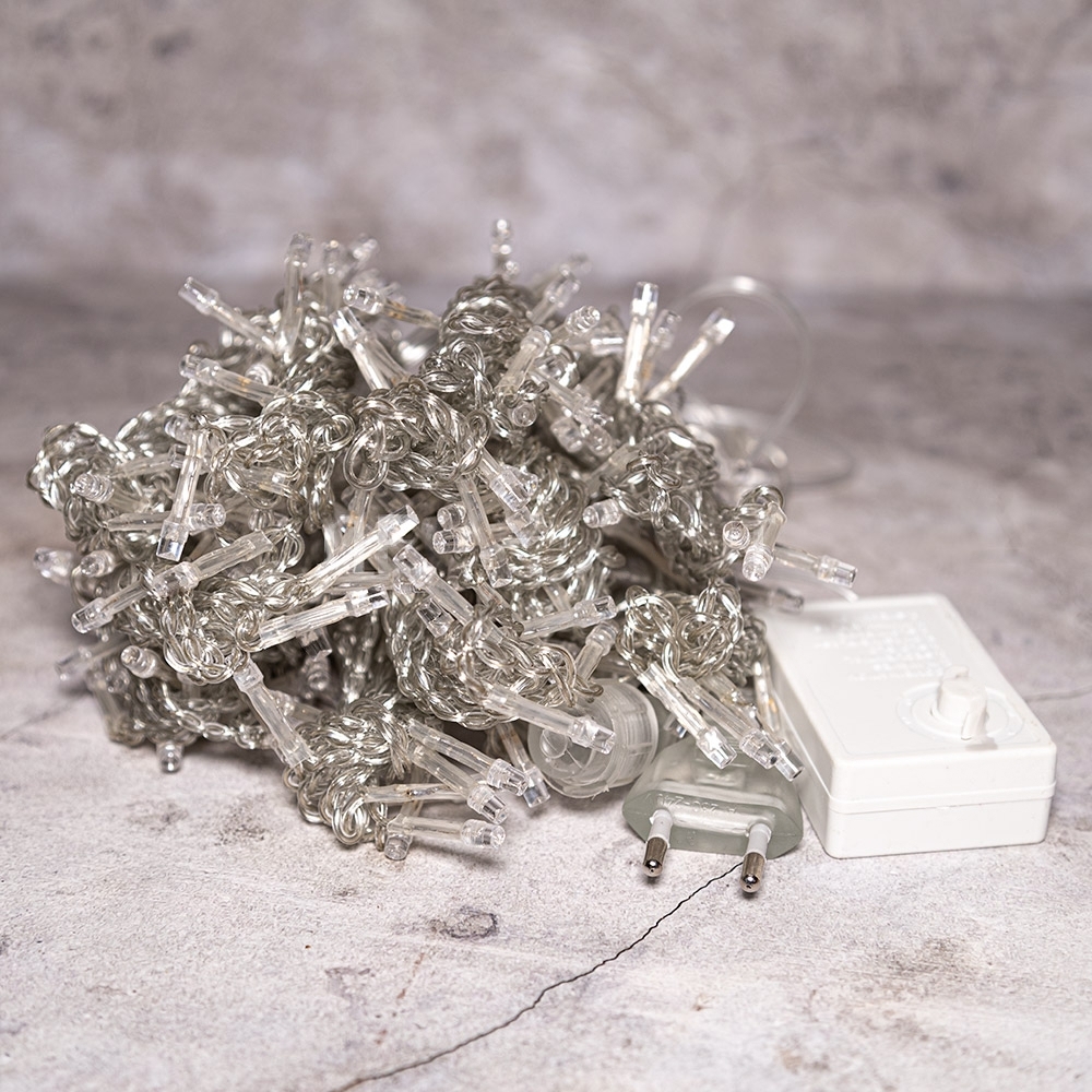 Занавес подключается к электрической сети 220В. Имеет возможность последовательного соединения в одну цепь. Все необходимое для подключения к сети и наращивания гирлянды идет в комплекте.