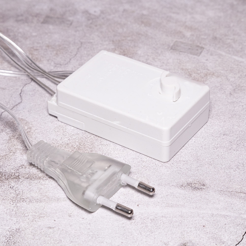 Занавес подключается к электрической сети 220В. Имеет возможность последовательного соединения в одну цепь. Все необходимое для подключения к сети и наращивания гирлянды идет в комплекте.