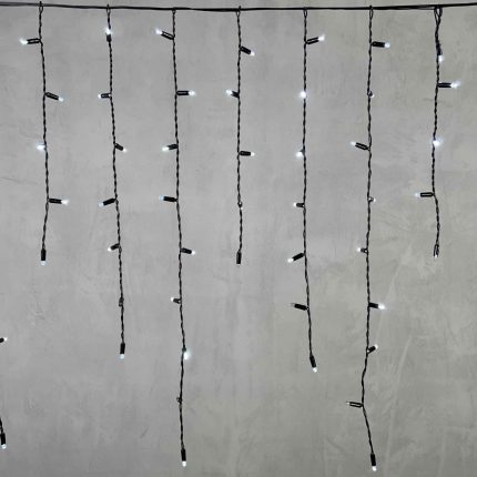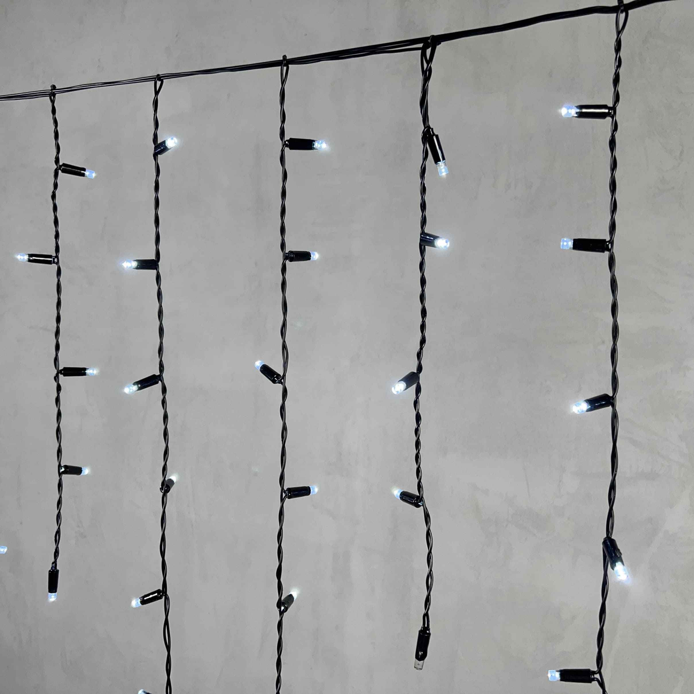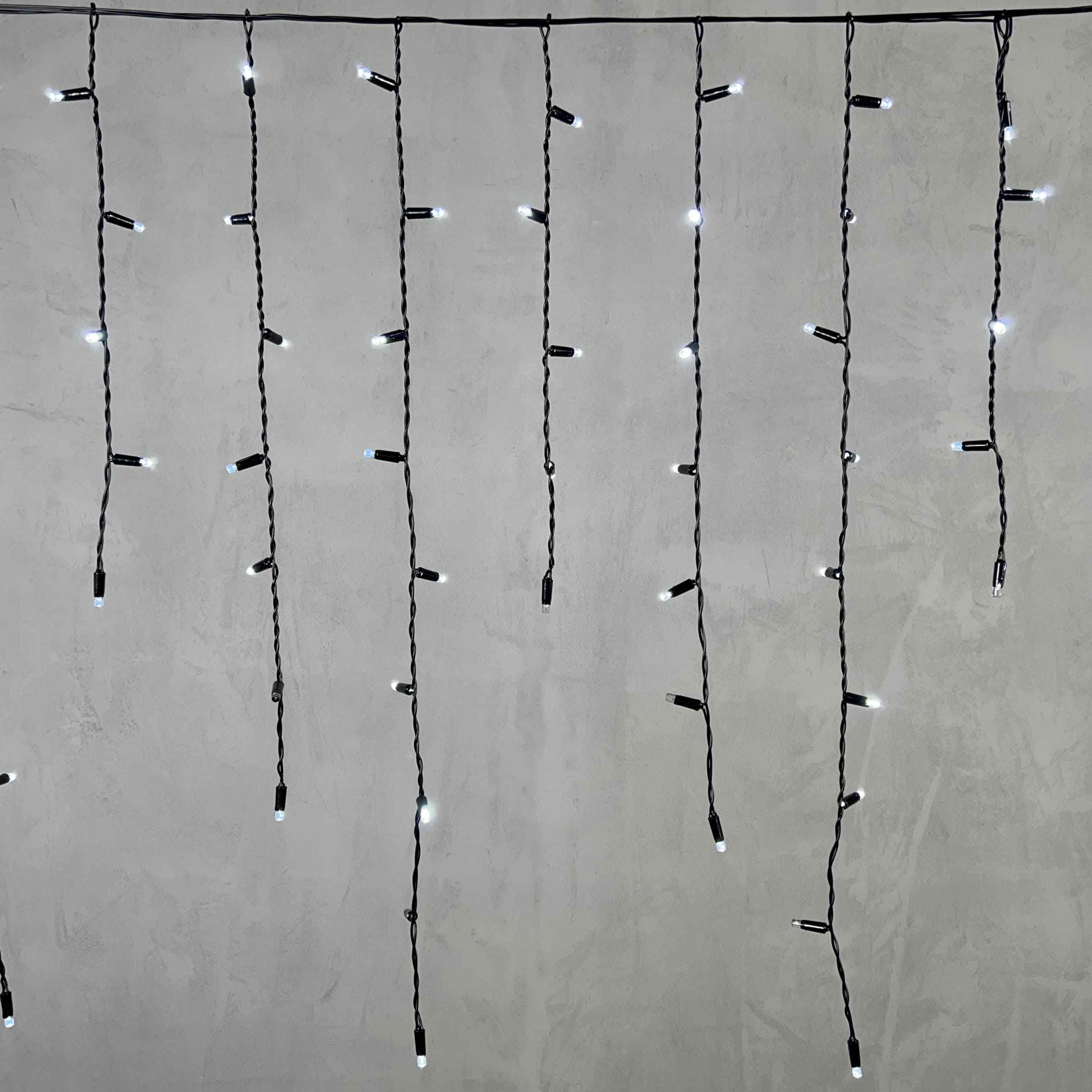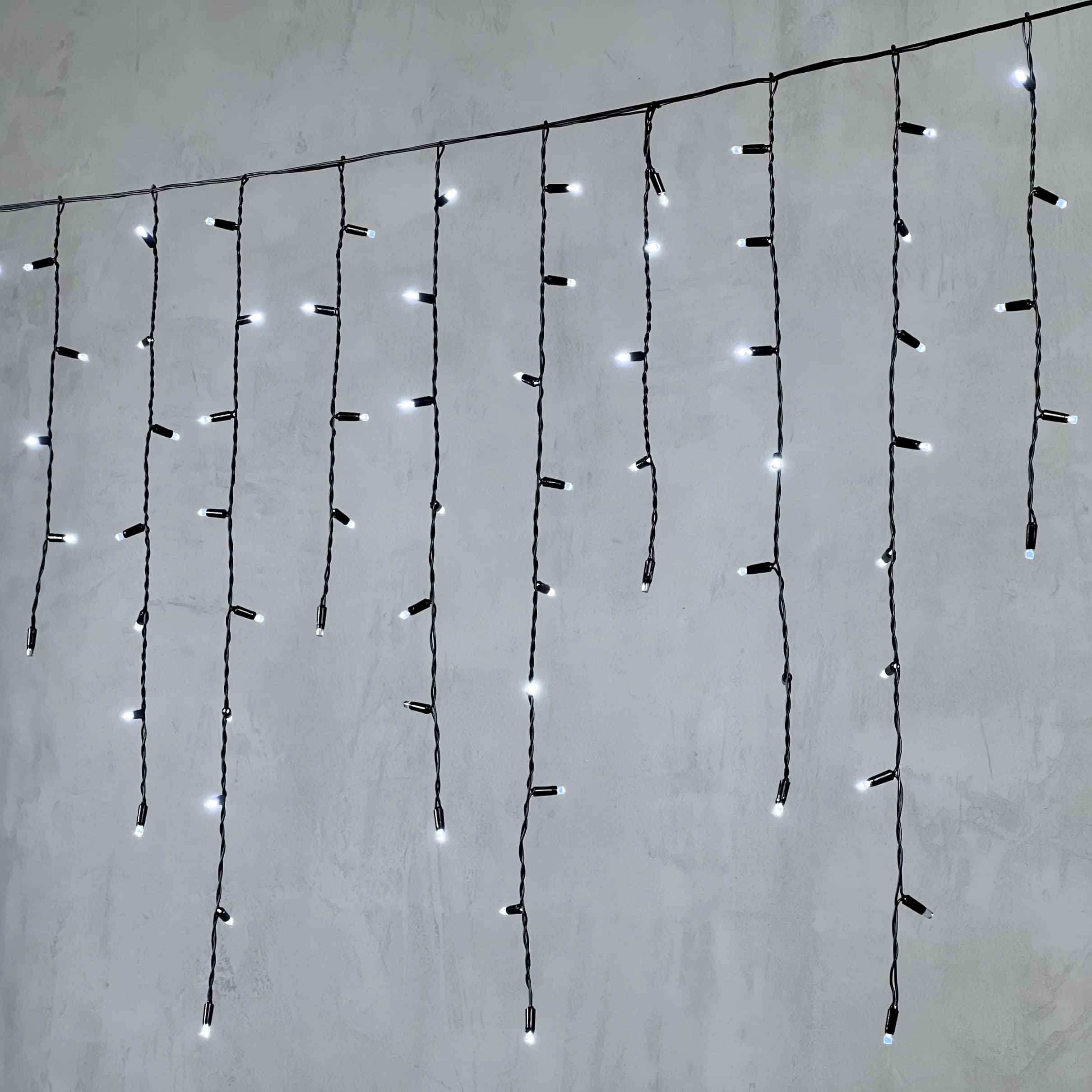 Гирлянда-бахрома LTC 3,2 м с белым свечением и эффектом мерцания белого диода. Провод — чёрный ПВХ. 168 LED, длина свесов до 90 см. Отличный вариант для сезонной подсветки фасадов.