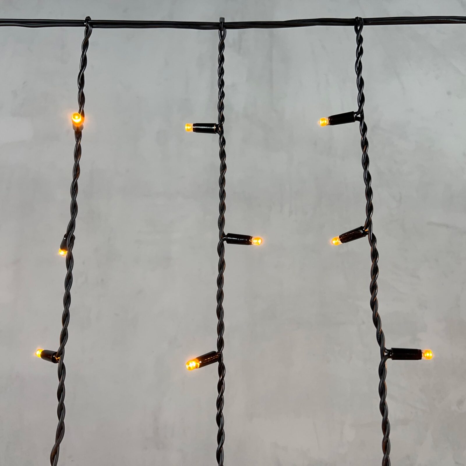 Жёлтая гирлянда-бахрома длиной 3,2 м и высотой 0,9 м, с 168 LED и каучуковым чёрным проводом 3.3 мм. Плотное свечение, режим статики, защита IP65. Подходит для улицы, фасадов, навесов и террас. Подключение в цепь до 10 гирлянд. Работа от сети 220 В.