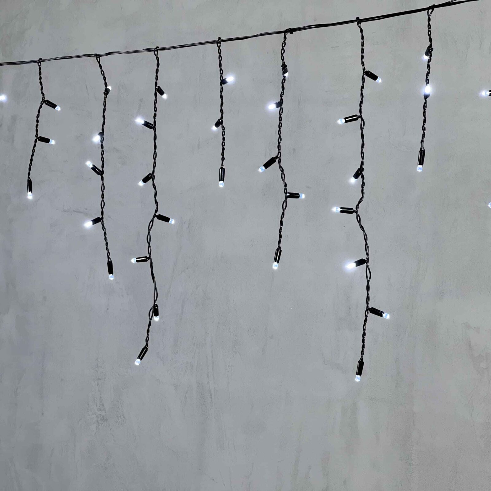 Белая уличная гирлянда бахрома длиной 3,1 м и высотой 0,5 м. 120 ярких светодиодов, чёрный ПВХ-провод, защита IP65. Идеальна для украшения фасадов, карнизов, навесов. Подключается к сети 220 В, соединяется в линию до 10 штук. Готова к зимним условиям.