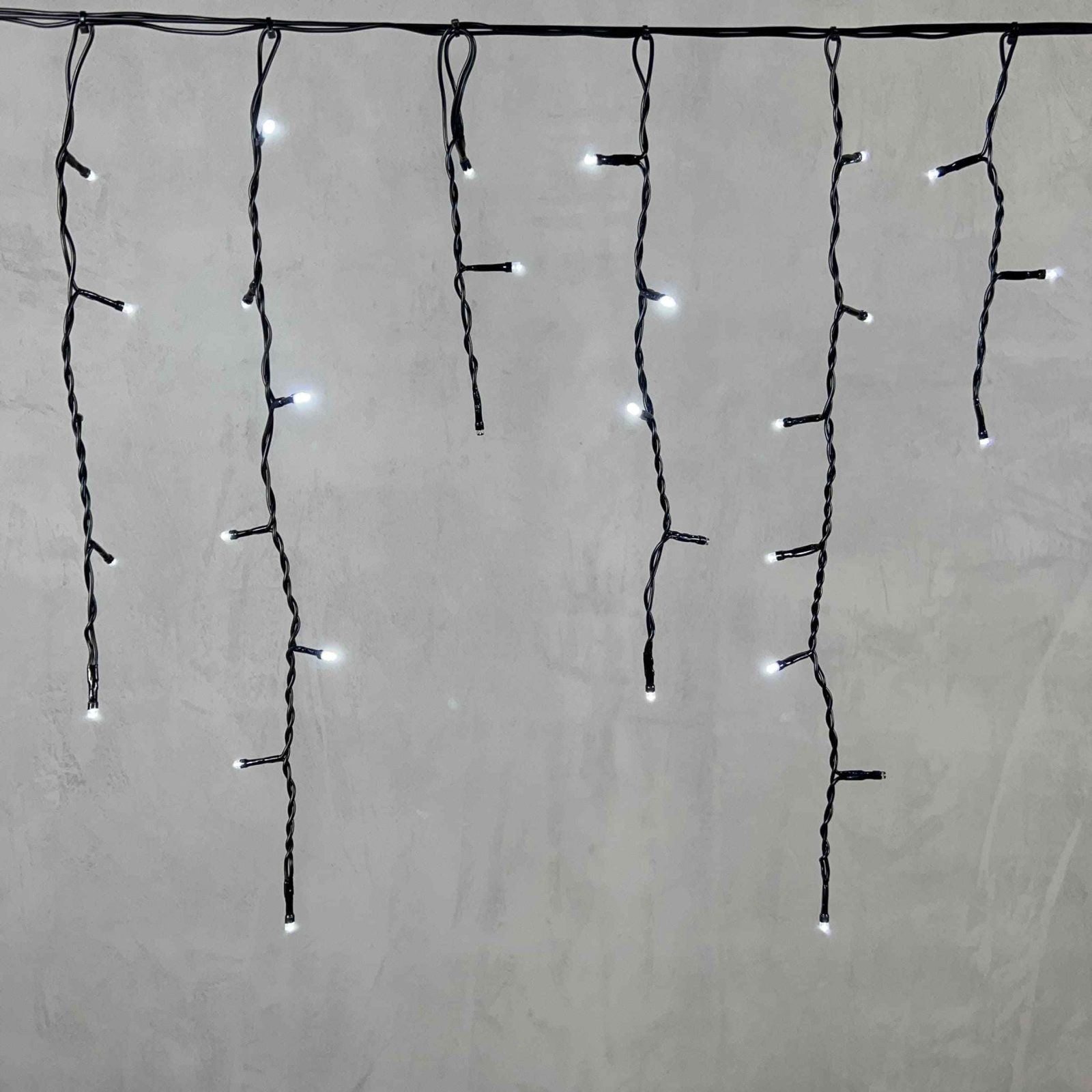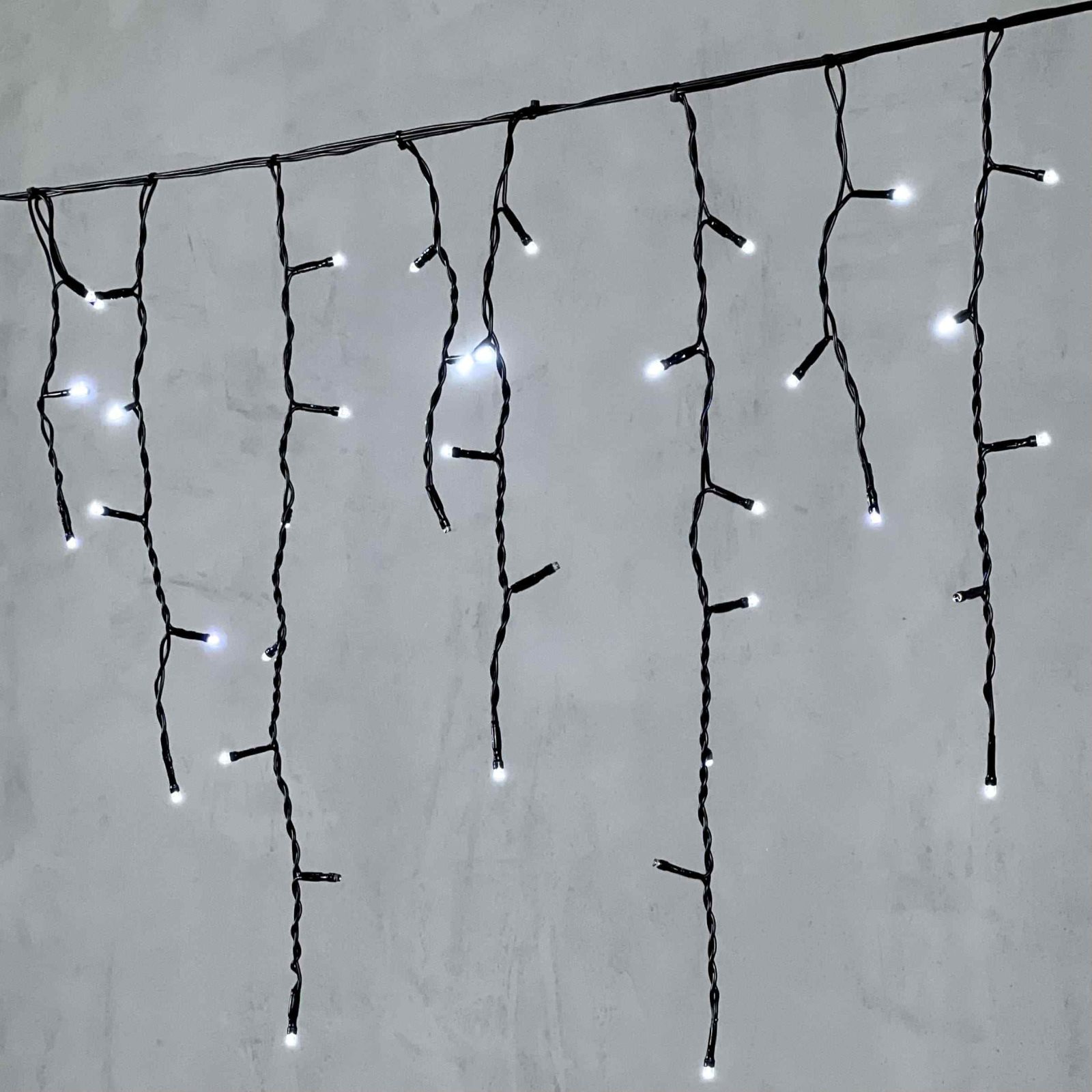Элегантная гирлянда-бахрома с белым светом и лёгким мерцанием. Длина 3,1 м, 150 LED, чёрный ПВХ-провод, защита IP54. Готова к подключению. Подходит для оформления фасадов, крыш, навесов. Можно соединить до 10 гирлянд подряд.