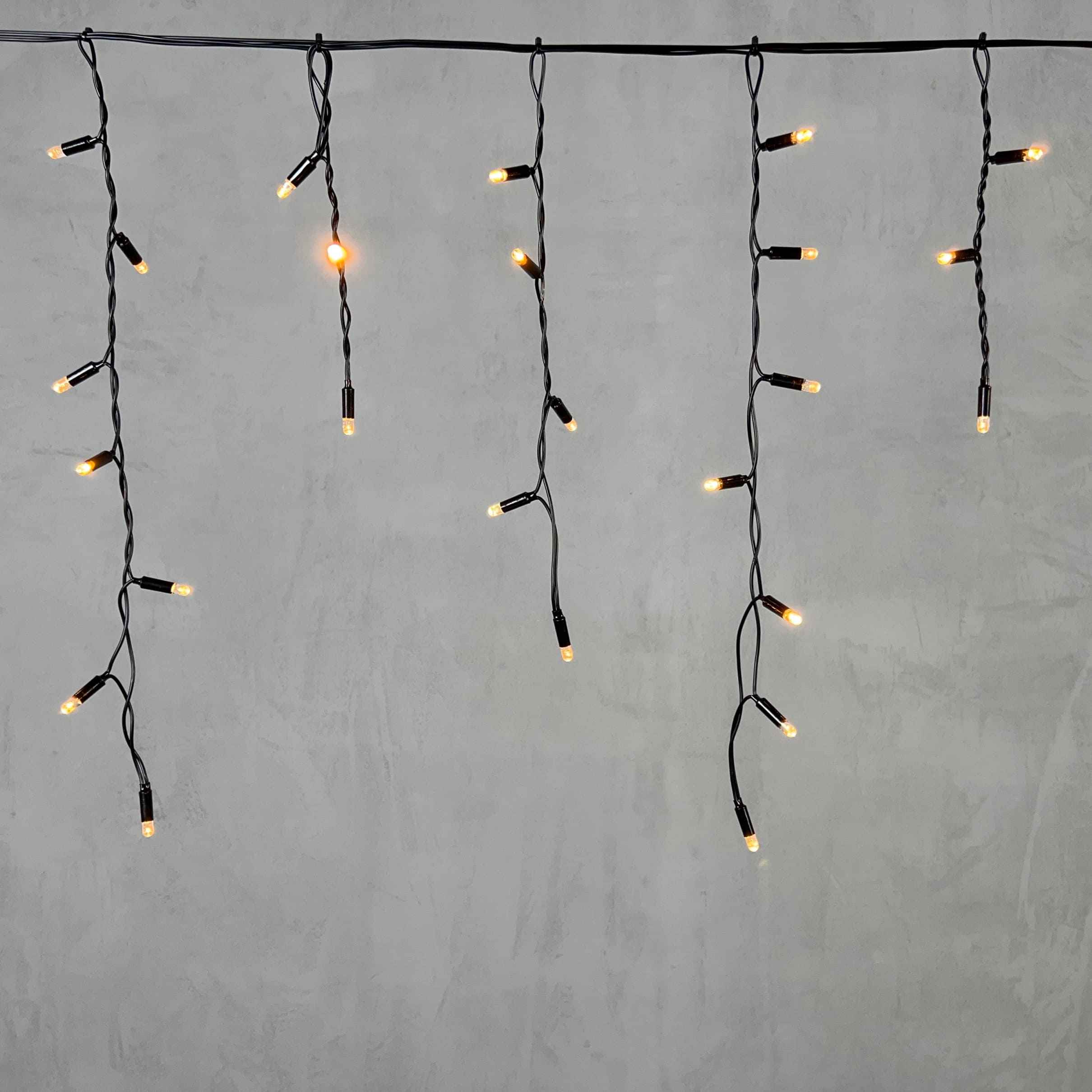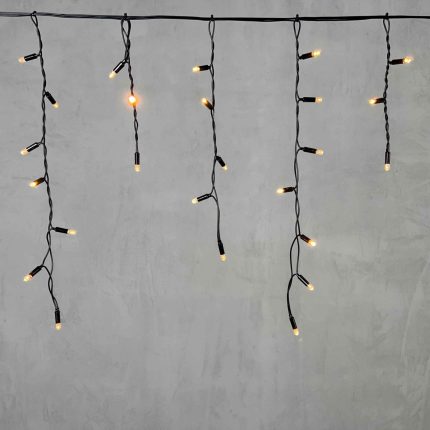 Гирлянда бахрома с колпачками и экстра тёплым свечением для уличного оформления. Чёрный ПВХ-провод — практичный и малозаметный. 120 LED, длина 3,1 м, высота свесов — 0,5 м. Свет мягкий, ровный, с акцентом на уют и атмосферу. IP65, морозостойкость до −30 °C. Надёжное решение для фасадов и входных групп.