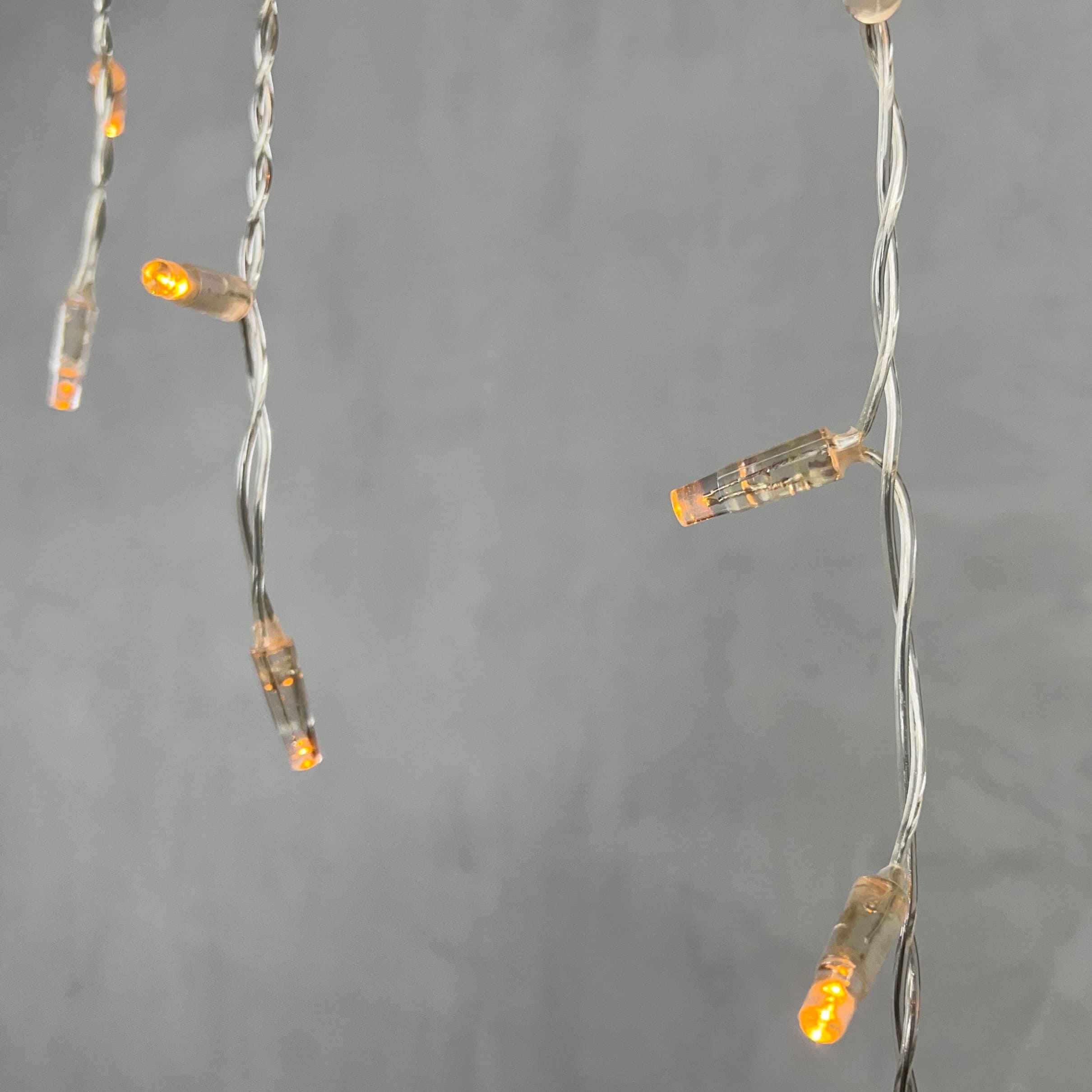 Прозрачный провод делает монтаж почти незаметным днём. Свет — жёлтый, плотный и тёплый.