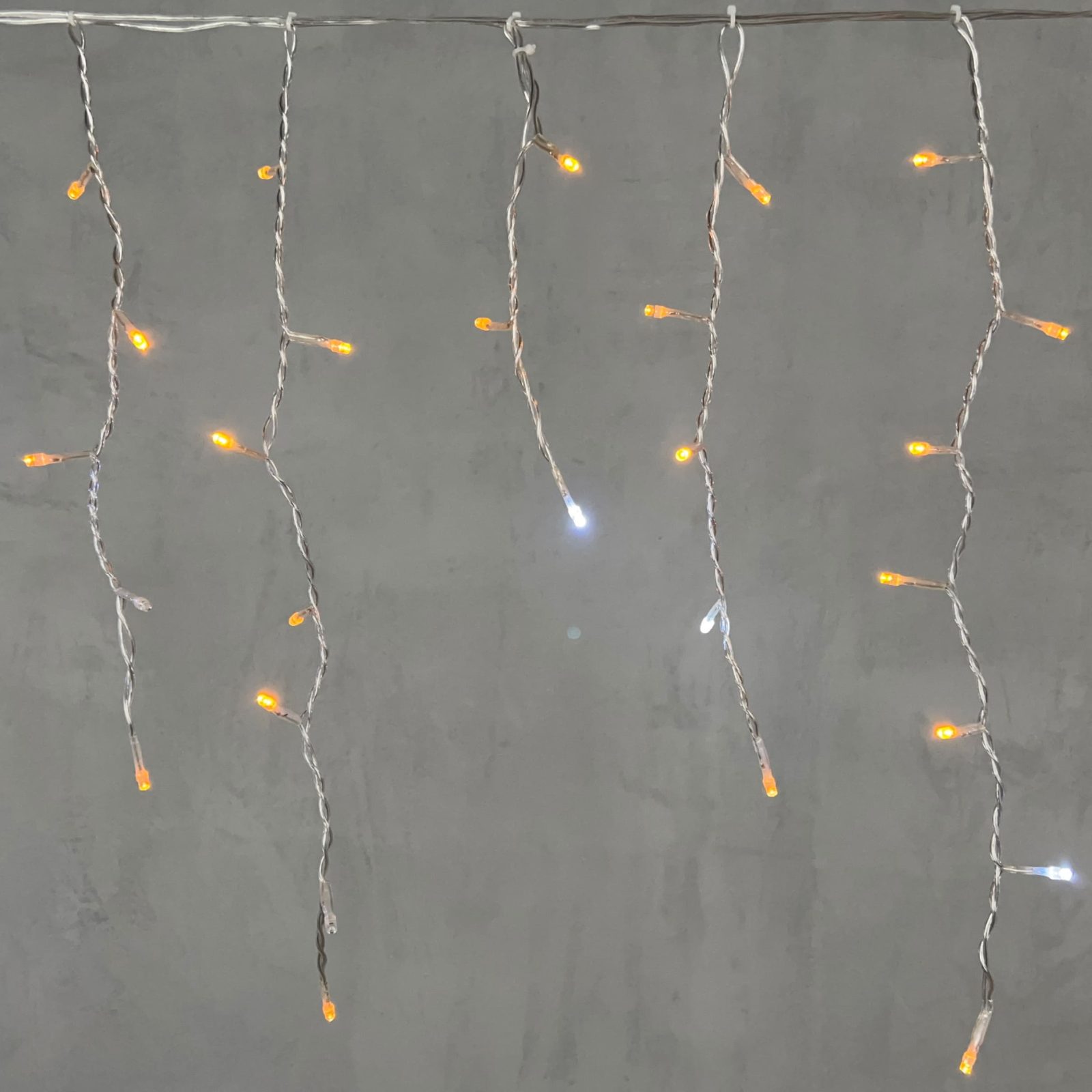 Жёлтая гирлянда-бахрома длиной 3,1 м с белыми мерцающими диодами. 150 LED, прозрачный ПВХ-провод, IP54, подключение в комплекте. Идеальна для фасадов, крыш и входных групп. Соединяется в цепь до 10 гирлянд, работает от сети 220 В.