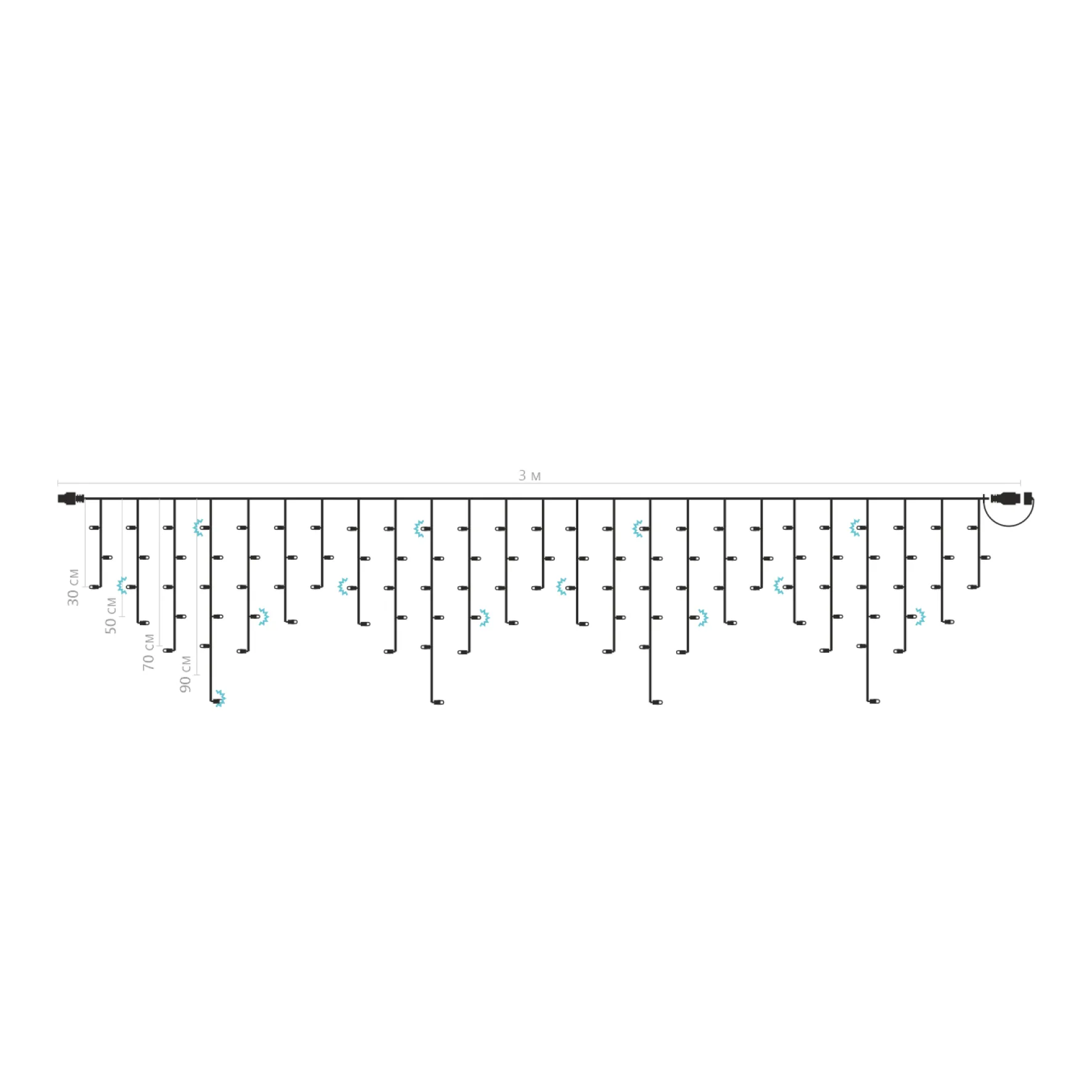 Формат 3 метра в длину и 0,3–0,9 м по высоте нитей идеально подходит для компактных объектов и точной подгонки. Шаг между лучами — 12,5 см, что обеспечивает равномерное, насыщенное освещение без "пустот". Гирлянда легко монтируется, не требует специальных инструментов, может использоваться как самостоятельный элемент или в составе цепи до 10 штук.