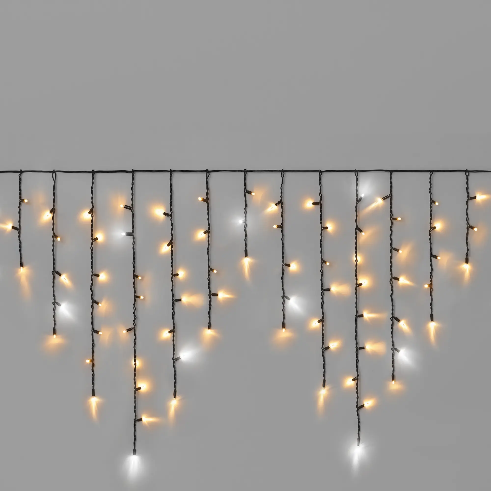 Гирлянда-бахрома 3×0,9 м с тёплым белым светом и эффектом мерцания. Чёрный морозостойкий каучуковый провод 3,3 мм. 144 диода, надёжная степень защиты IP65. Идеальна для фасадов, заборов и перил.