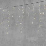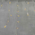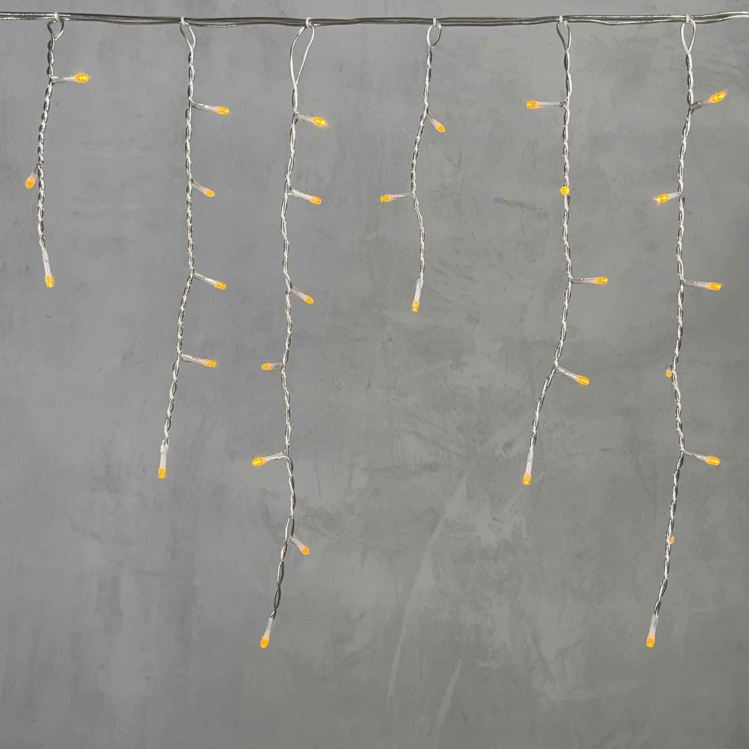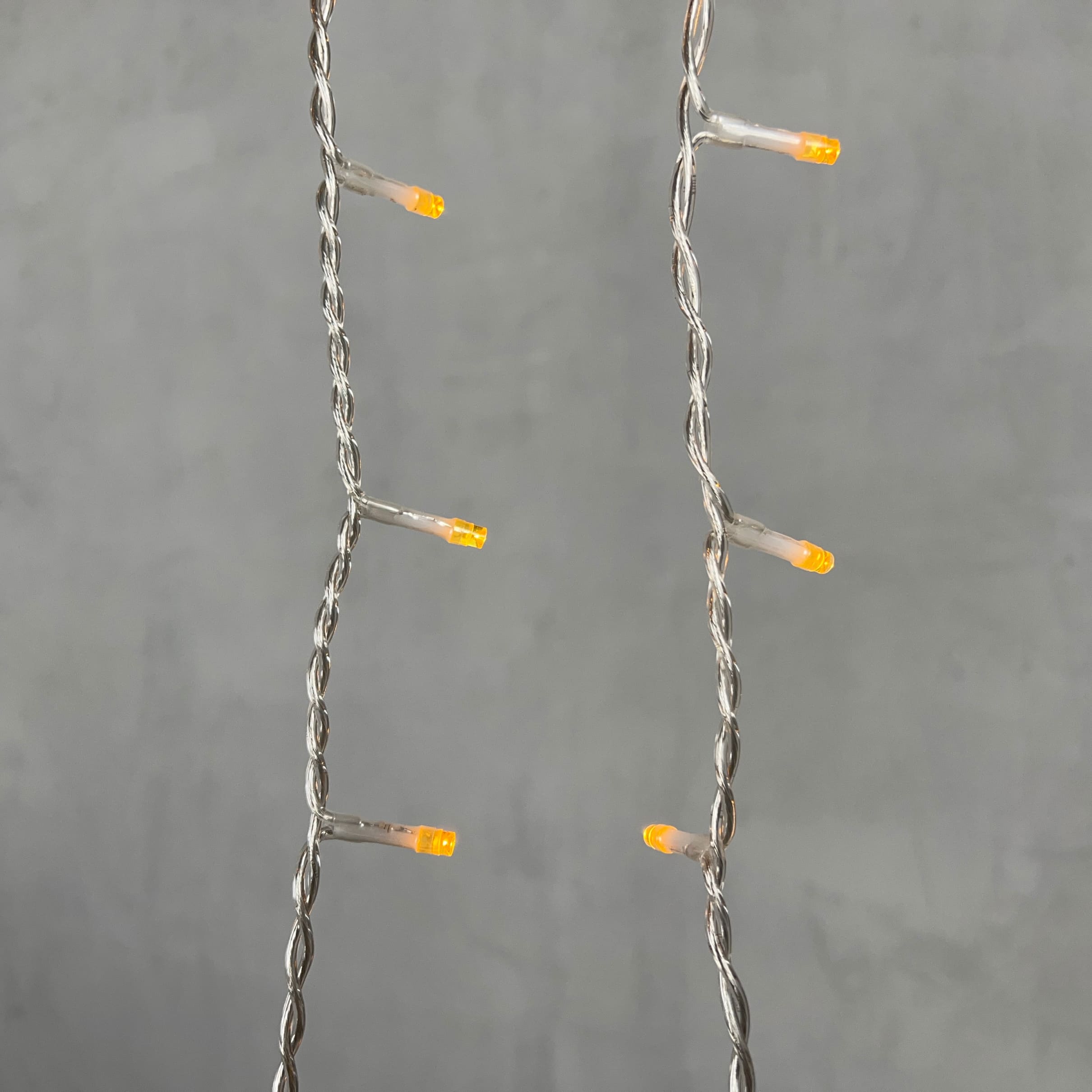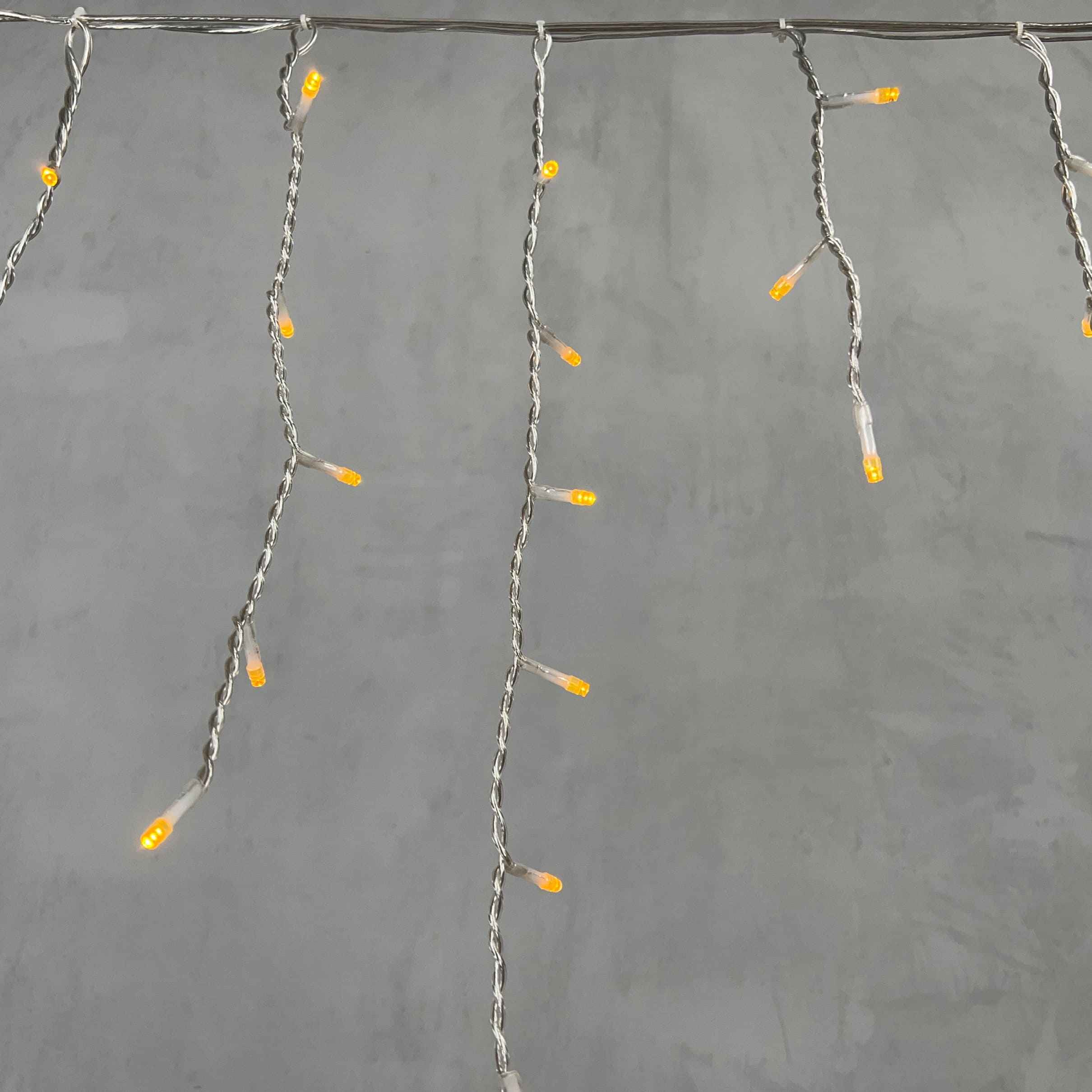Гирлянда-бахрома длиной 3 м с тёплым жёлтым светом и 150 LED на прозрачном силиконовом проводе. Подходит для улицы. IP65. Безопасна и надёжна даже в мороз.
