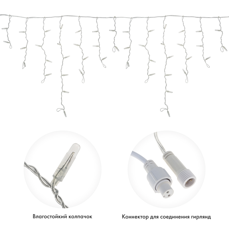 Длина гирлянды — 4,8 м, высота лучей — 60 см. 176 светодиодов равномерно распределены по 48 нитям, создавая насыщенное и однородное свечение. Такая конфигурация идеально подходит для карнизов, козырьков, балконов, навесов и ограждений.