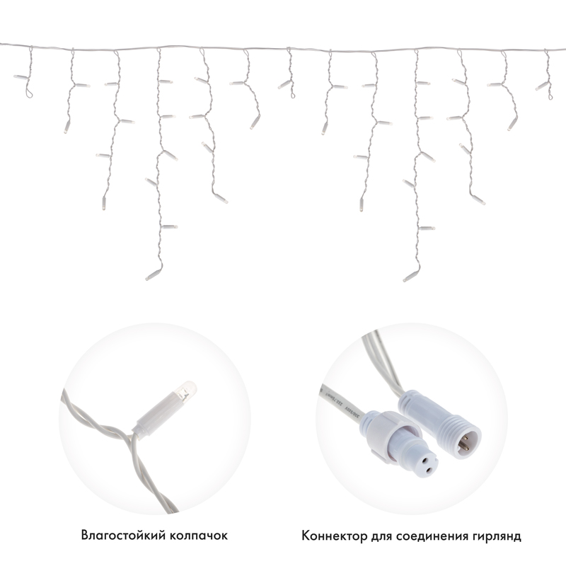 Устройство оснащено 152 светодиодами, равномерно распределёнными на 48 нитях по всей длине 4,8 метра. Это обеспечивает насыщенное и равномерное свечение, придающее фасаду чёткие и выразительные контуры. Высота падения нитей — 0,6 м — отлично подходит для оформления ограждений и навесов.