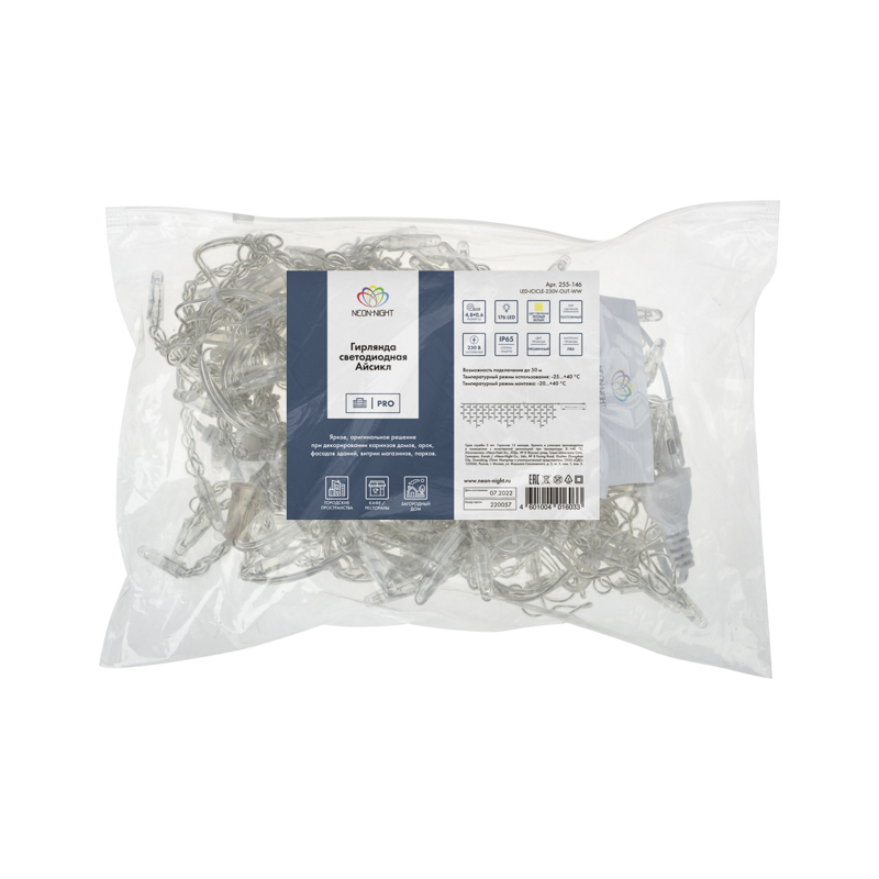 На концах гирлянды расположены соединители, которые позволяют объединять до 10 штук в одну цепь (до ~50 м). Это удобно при оформлении длинных фасадов, заборов, козырьков или витрин. Питание — от сети. Силовой шнур приобретается отдельно: вы можете выбрать подходящую длину и тип подключения.