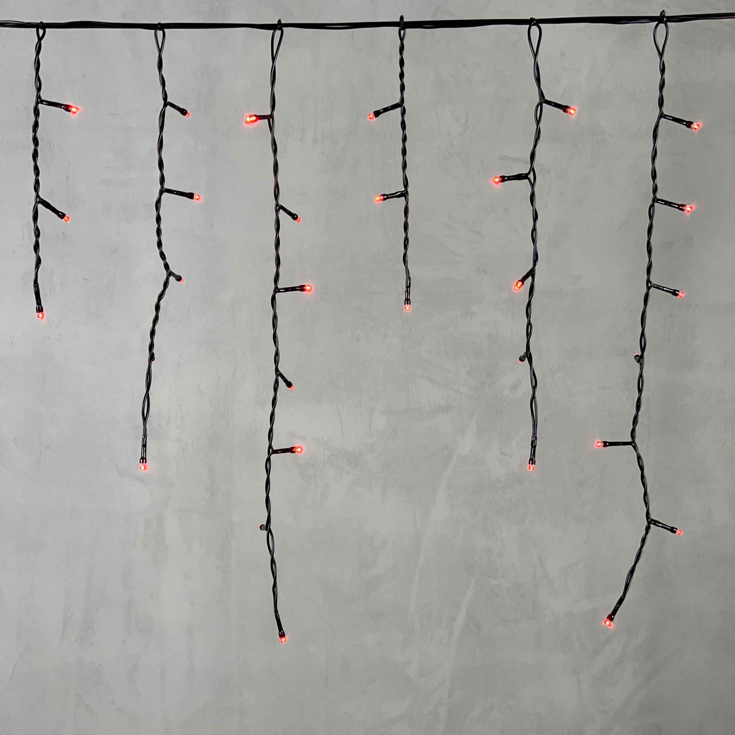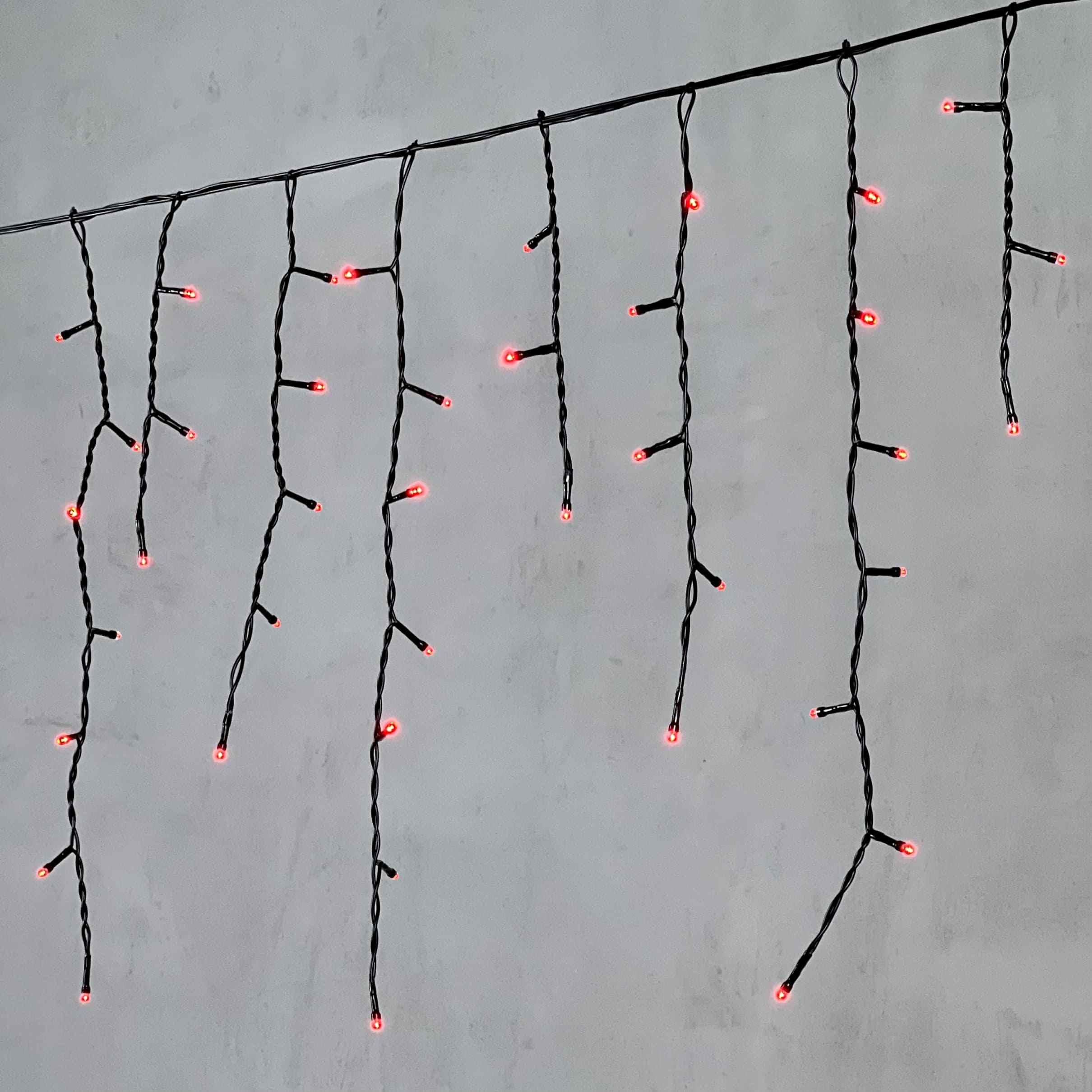 Гирлянда бахрома длиной 4,9 м с насыщенным красным свечением. 240 светодиодов, провод чёрный ПВХ, защита IP54. Эффектный выбор для уличного оформления фасадов и навесов.