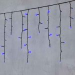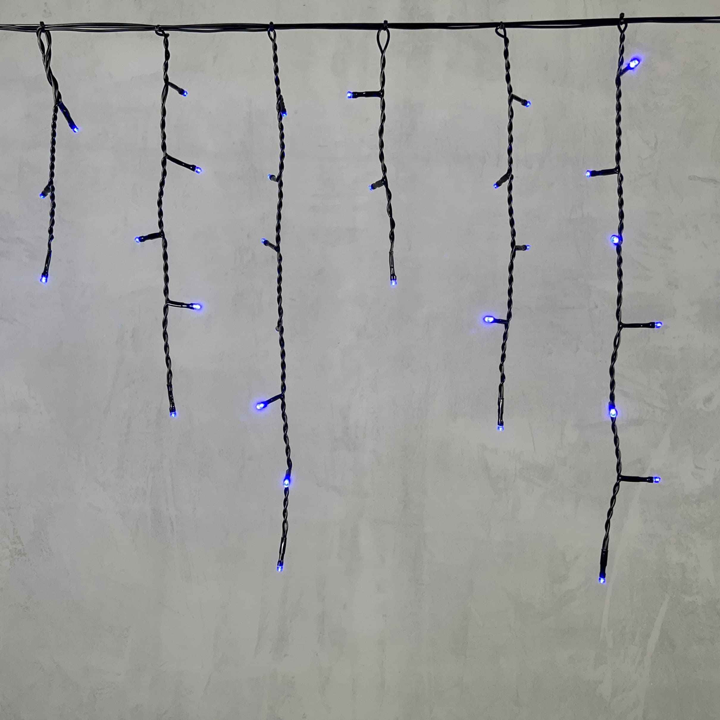 Гирлянда бахрома длиной 4,9 м с синим свечением, 240 светодиодов, чёрный ПВХ-провод. Устойчива к погоде, степень защиты IP54. Идеальна для фасадов и навесов.