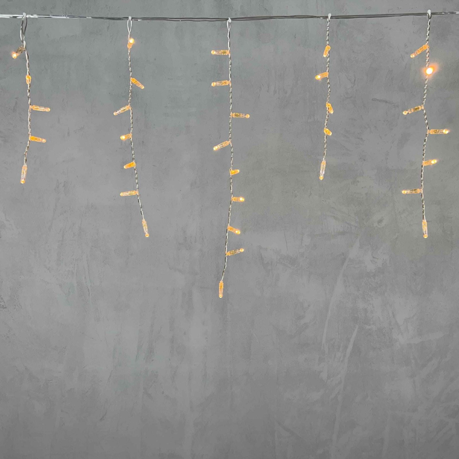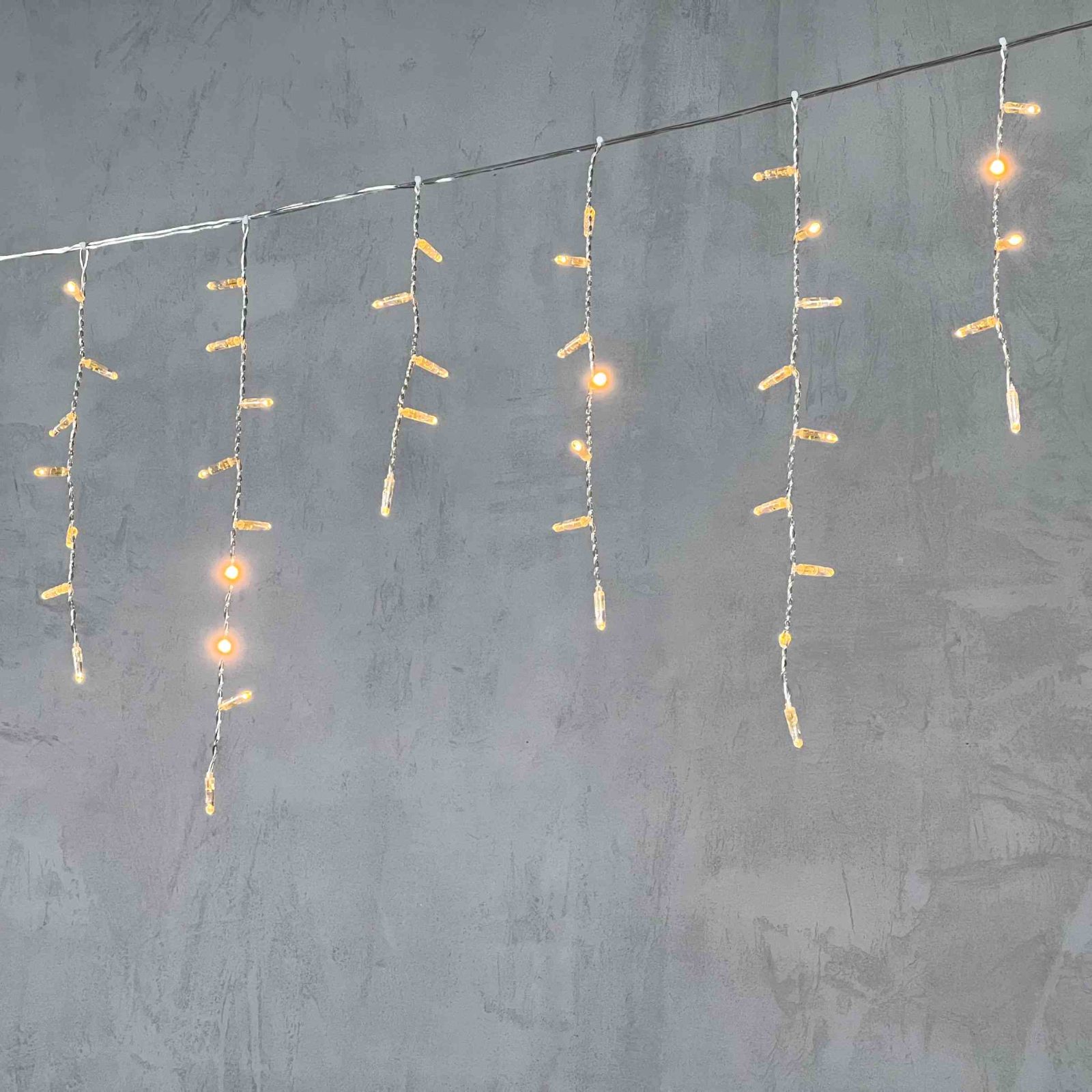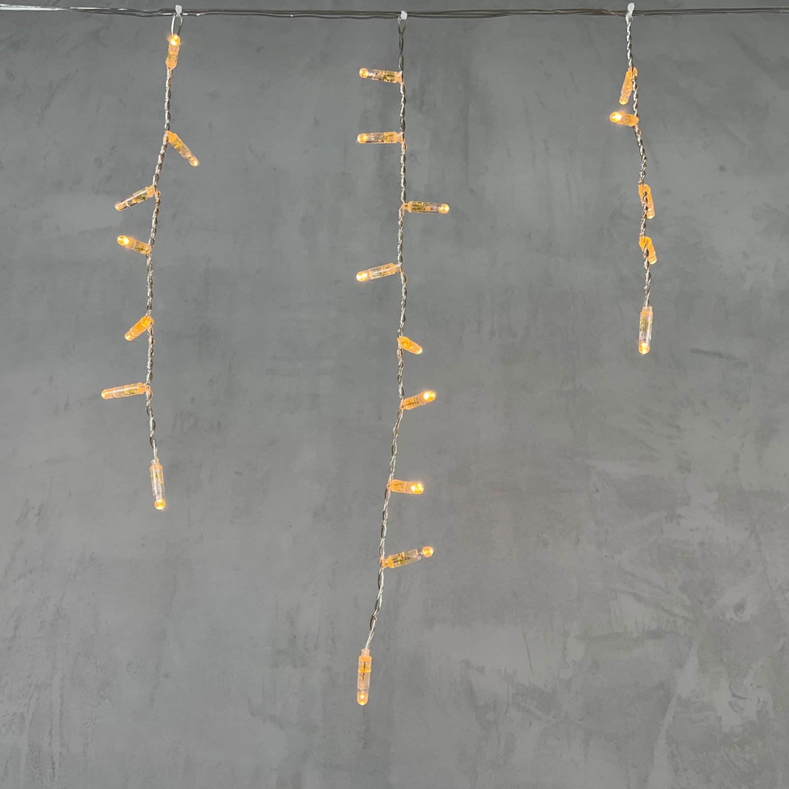 Провод — прозрачный, из ПВХ. Его не видно днём, особенно если дом светлый. Это идеальный выбор, если вы хотите, чтобы гирлянда была незаметна при выключенном свете. Такой вариант часто используют на фасадах, где эстетика важна даже в светлое время суток.