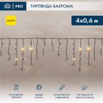 Гирлянда бахрома 4×0,6 м с жёлтым свечением и статичным режимом. 128 диодов, прочный чёрный каучуковый провод 2,3 мм, питание от сети 230 В, защита IP67. Подходит для улицы и фасадов, соединяется в цепь до 15 штук.