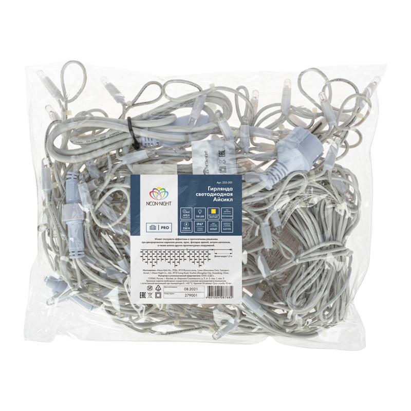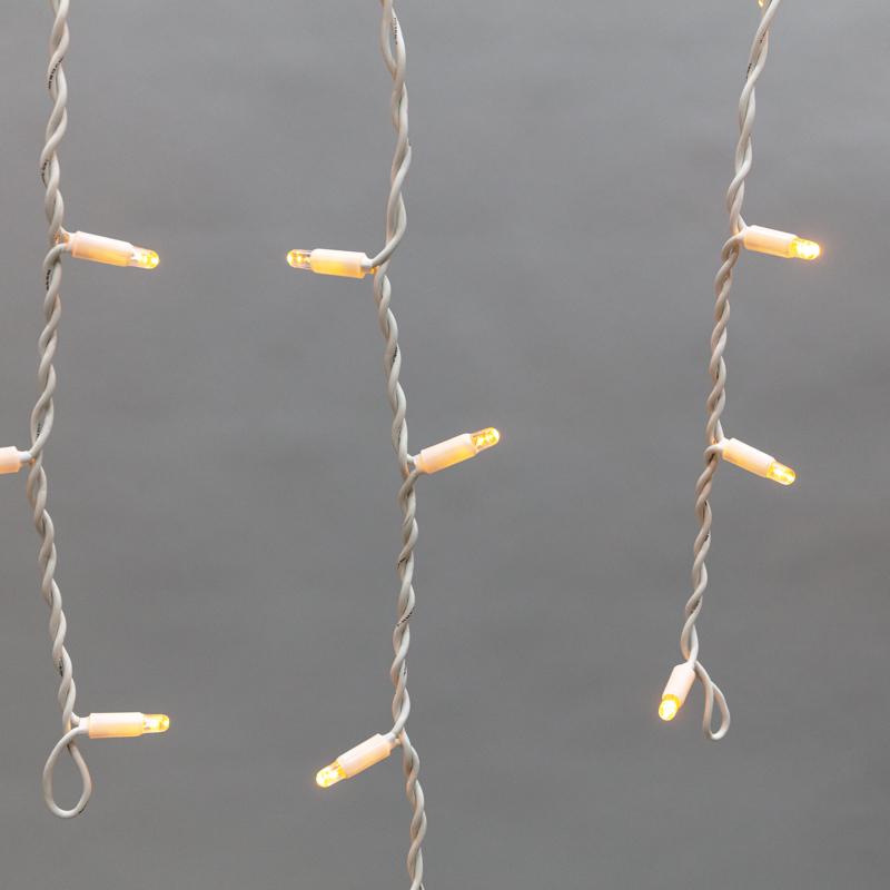 Гирлянда бахрома 4×0,6 м с ровным жёлтым светом и статичным свечением. Провод — белый морозостойкий каучук 2,3 мм. 128 LED, питание от сети 230 В, класс защиты IP67. Подходит для улицы и фасадов, соединяется в цепь до 15 штук.