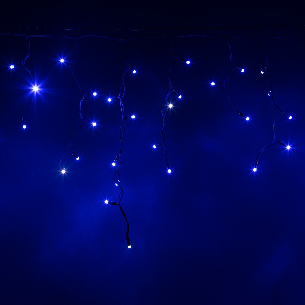 Гирлянда-бахрома 5 м с синим мигающим светом — для оформления фасадов, крыш, заборов. 150 диодов, IP65, провод 3.3 мм из каучука. Готова к уличному монтажу. В комплекте — сетевой кабель.